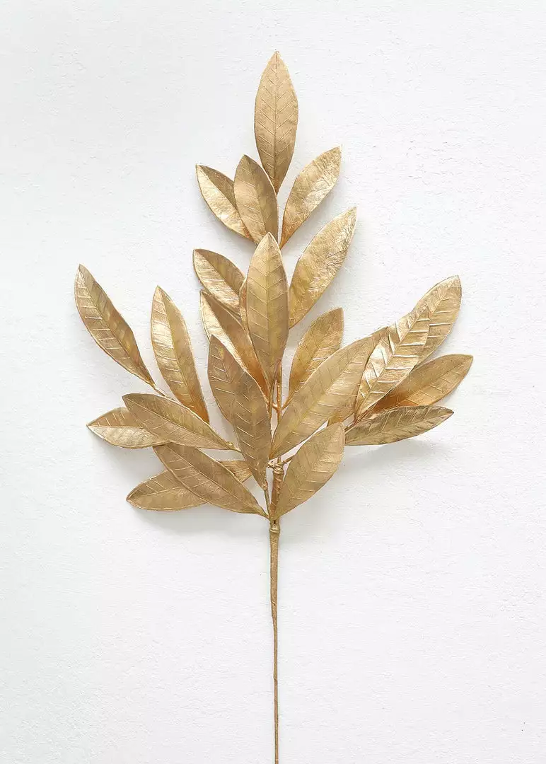 Get festive with this gold metallic fake bay leaf spray. Accent your faux holiday greenery, garlands, or floral arrangements with a hint of gold, or trim down to add an extra something special to your holiday gift wrap. The artificial bay leaf stem is fully wired for easy styling, but easy enough to trim down for any floral projects.