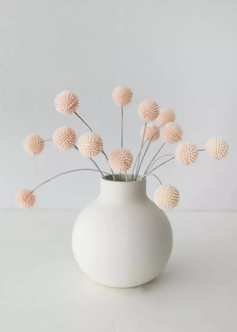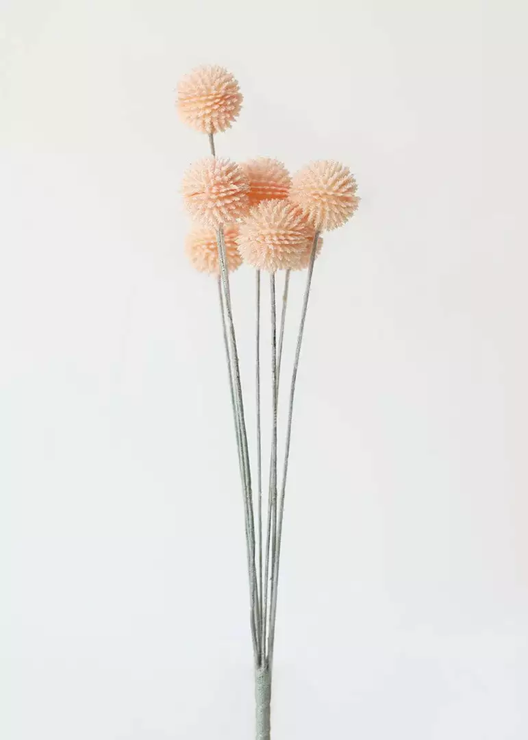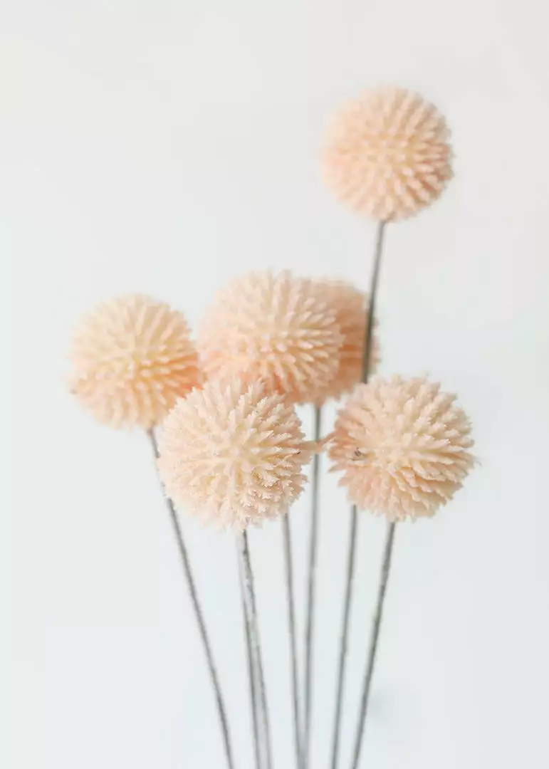 Add texture and the most delicate hint of color with soft peach artificial billy buttons. These flower heads are slightly flocked to lend a realistic look and feel in addition to lifelike stems that are textured and wired to easily create shape to your arrangements. These peachy-pink florals include 7 blooms to each base stem that can easily be trimmed down for separate placement in bud vases or for use in different floral projects.