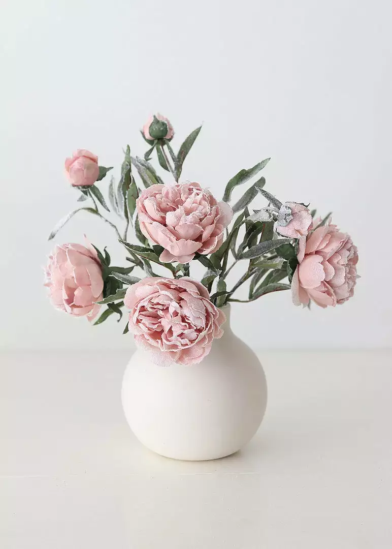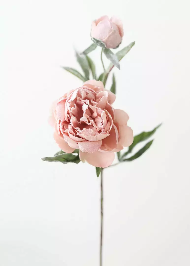 Beautiful pink blush faux peony flowers stem is sprinkled with a white dusting that gives it a snowed look. Style this snowy peony into Christmas wreaths and holiday floral arrangements for a soft, elegant look.