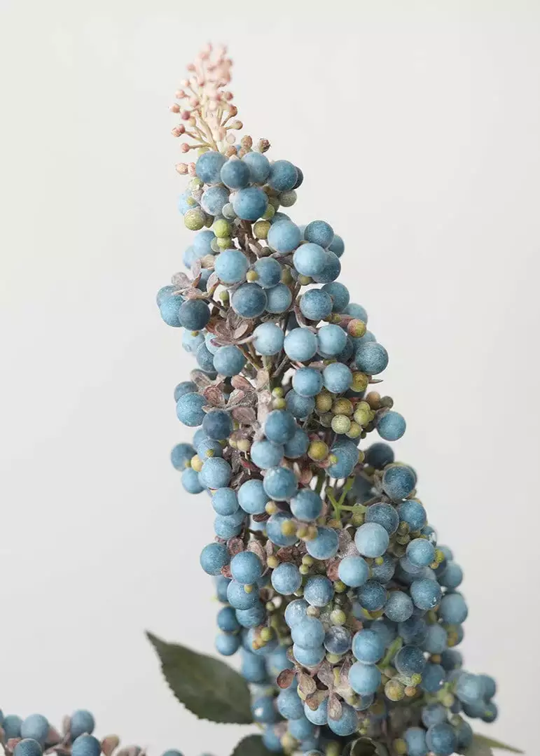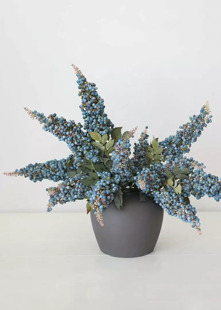 Simple home decor starts with oversized, artificial floral stems dramatic enough to be styled alone in a highly decorative statement vase. Create an arrangement made to last with these large, fake blue berry clusters to achieve that elevated look. The mix of blues and greens gives the berries a more natural appearance.