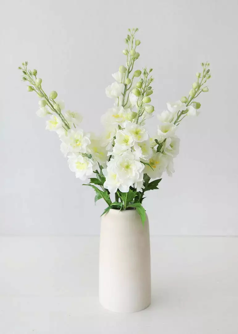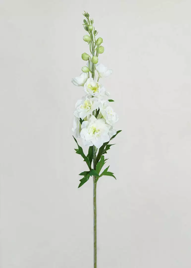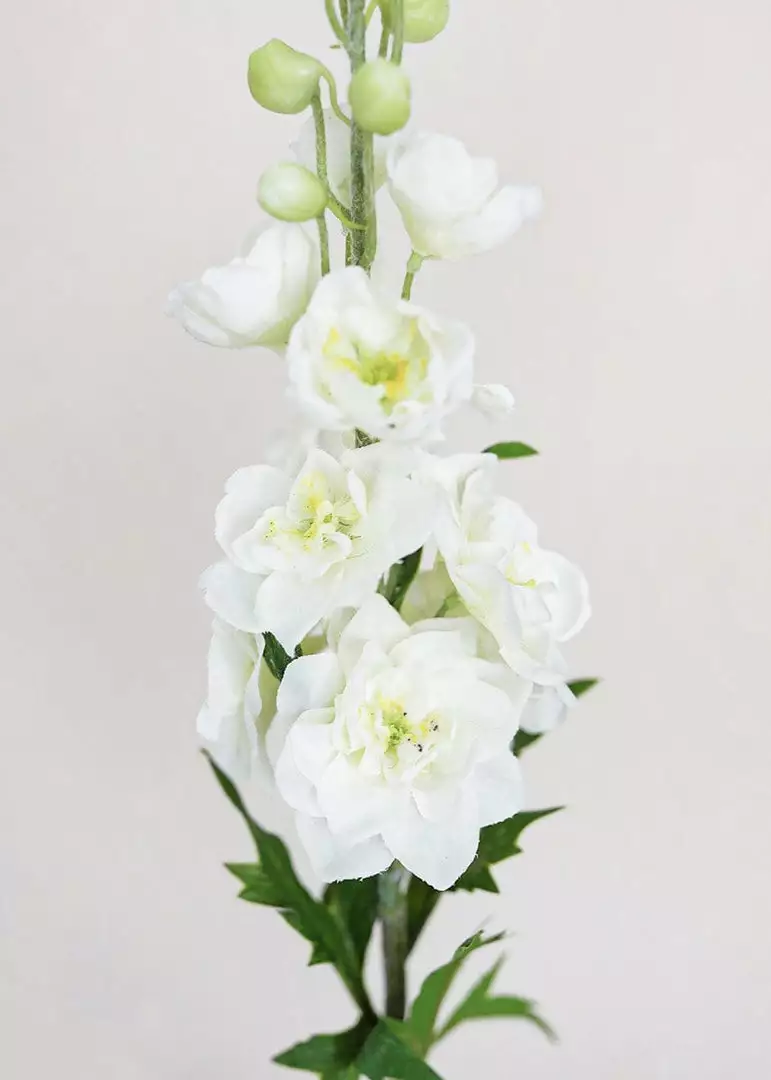 These aren’t your grandmother’s fake flowers. These white delphinium wildflowers feel as real as they look, with real-touch petals that feel damp to the touch. The flocked stem adds an extra layer of realism that makes this stem truly irresistible. The cream-white petals offer a soft yellow interior with a pistachio green plastic detail in the center. In true Larkspur wildflower fashion, this faux beauty mimics nature with glistening buds that form the signature “spike” of the delphinium and this majestic stem will draw attention from a distance.