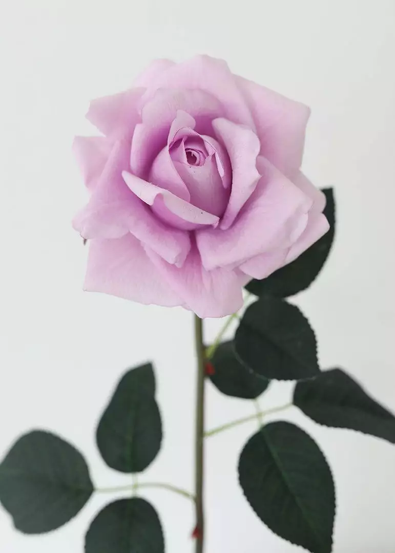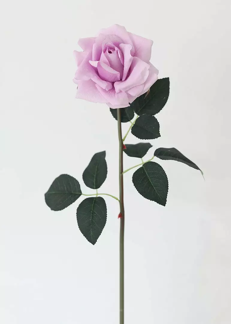 This beautiful lavender real touch rose stem is a perfect example of the most life-like faux flowers. Style these fake roses in your artificial flower arrangements or bouquets for an elevated look.