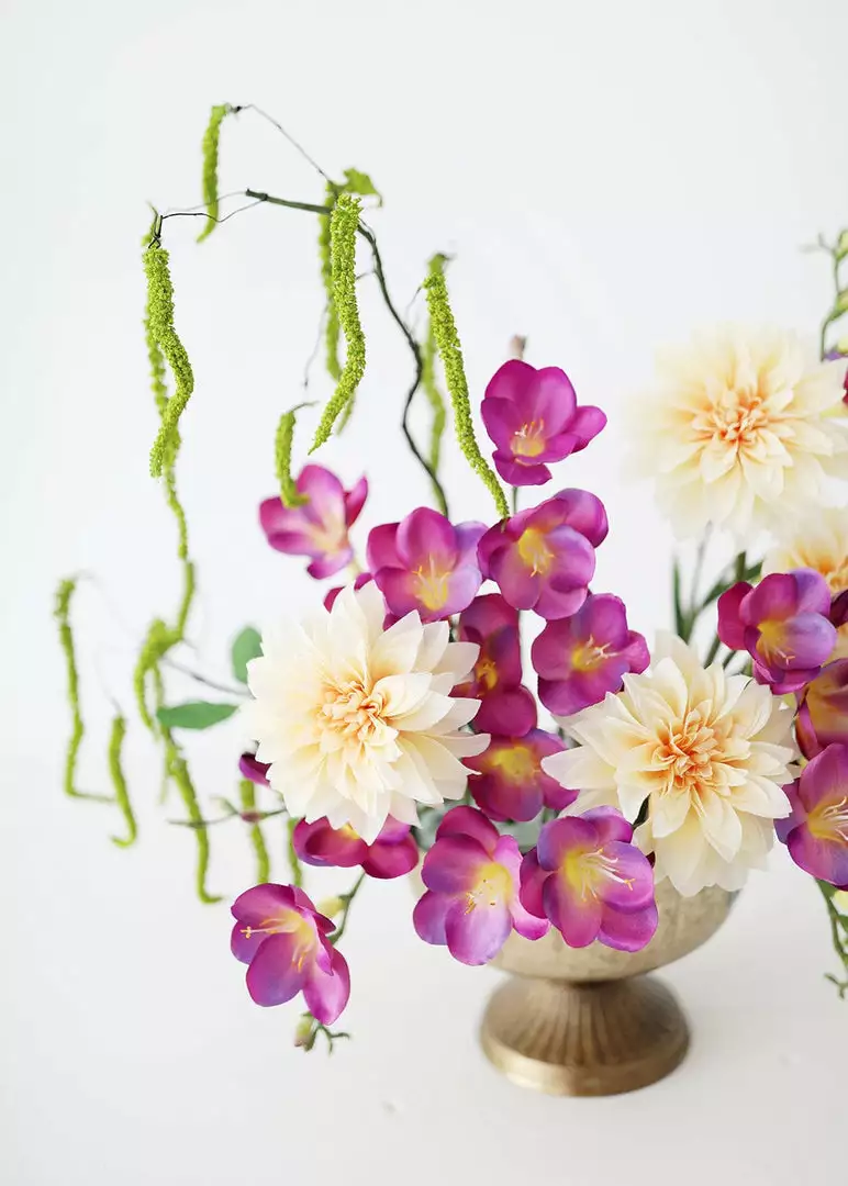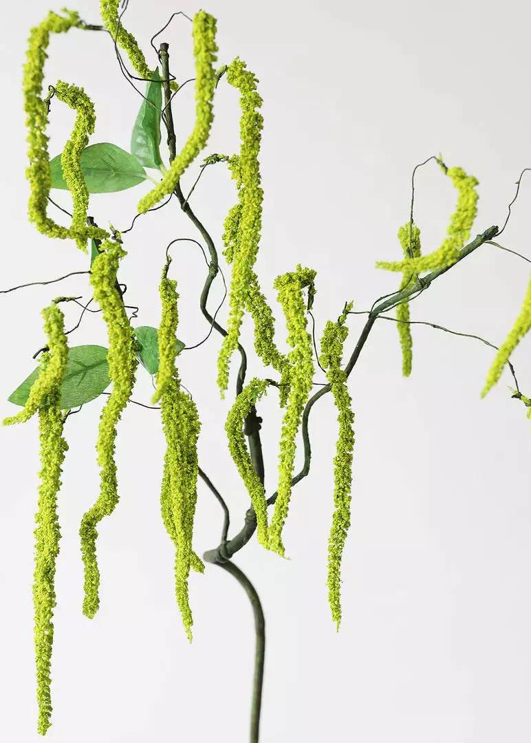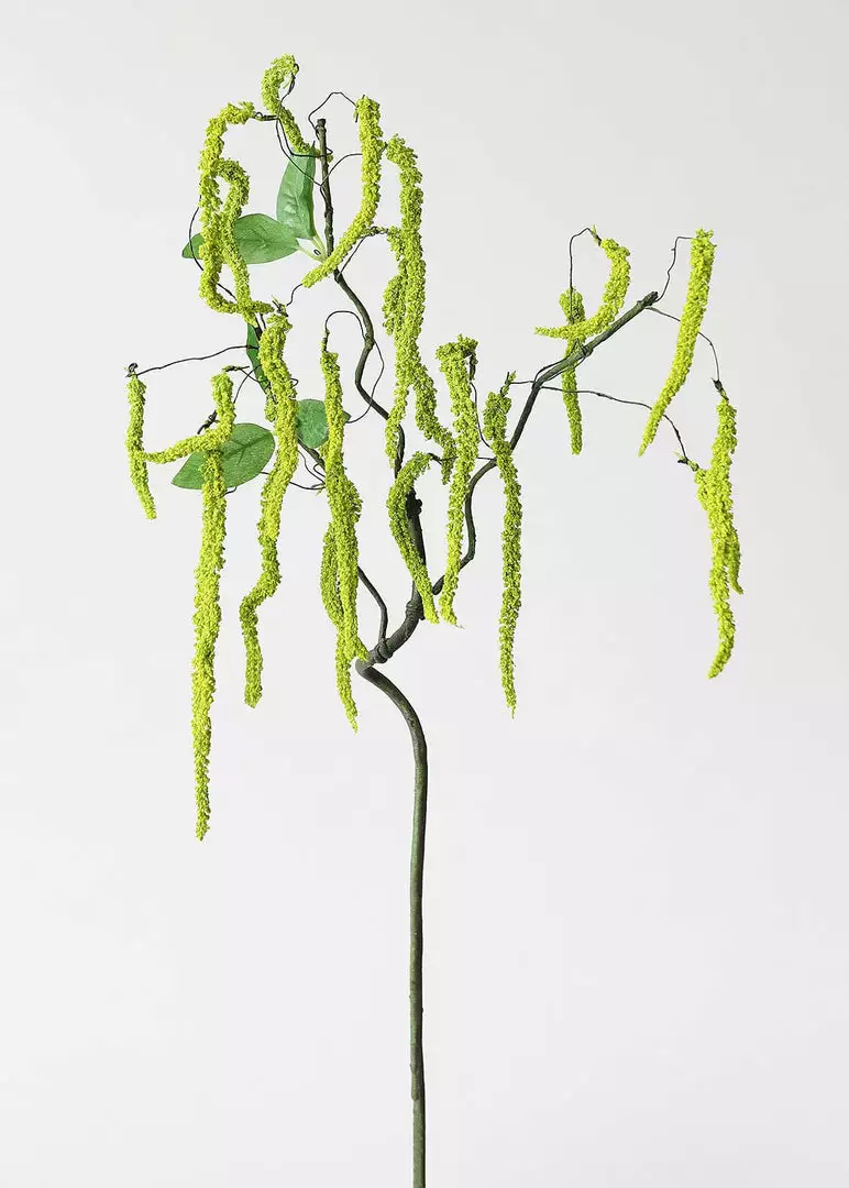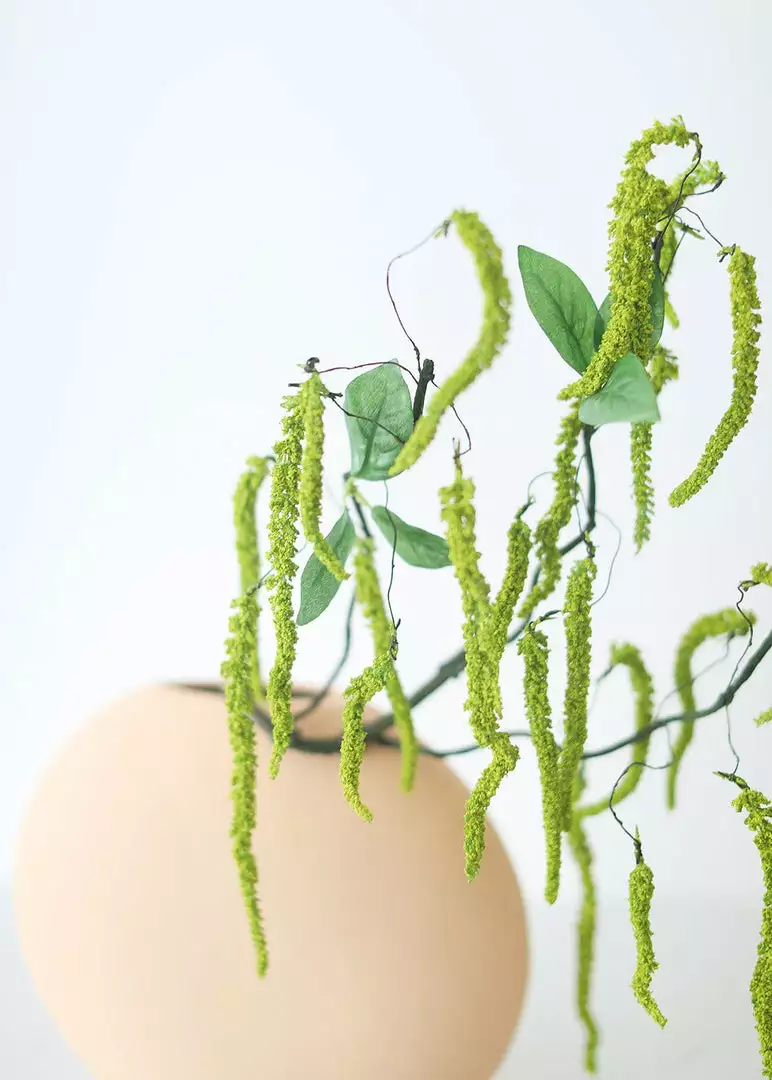 This artificial branch has beautiful green hanging amaranthus flowers. Style alone in a vase for an eye-catching centerpiece, or you can incorporate the cascading faux blooms into an arrangement for dimension and texture.
