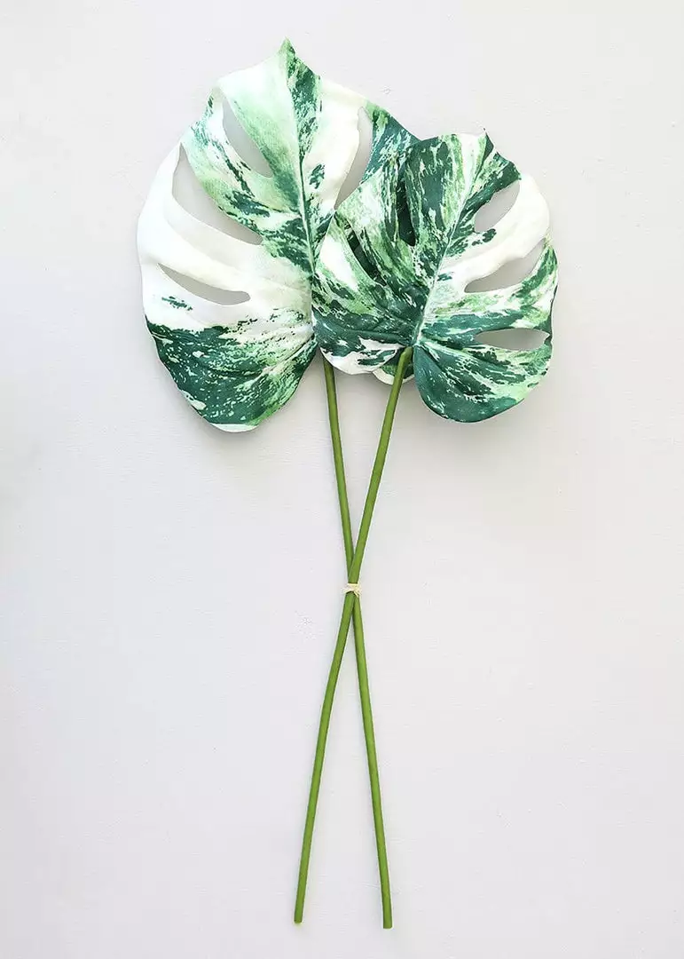 Find faux tropical leaves to make a stunning statement piece, like this gorgeous variegated green and white monstera palm leaf bundle with coloring on both sides of the leaves. Simply style these artificial palms in your tall vase.