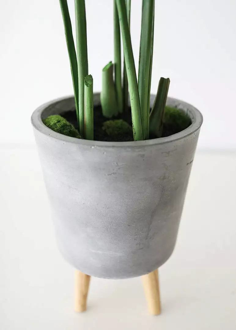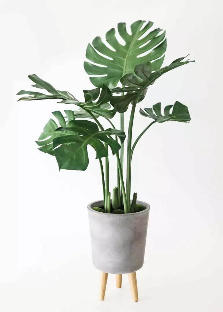 Looking for the best fake potted plants for your home decor? This striking green artificial monstera leaf tropical plant in a grey cement plant stand is a stylish choice. It needs no care to bring a lively look to any room!