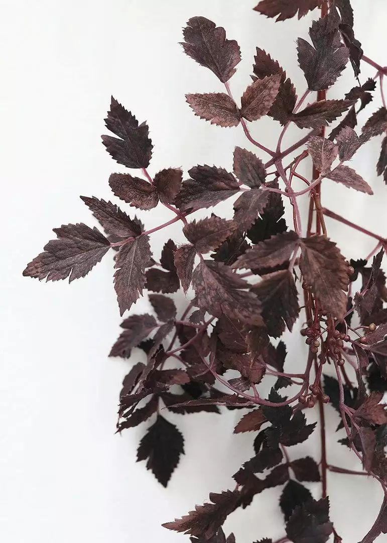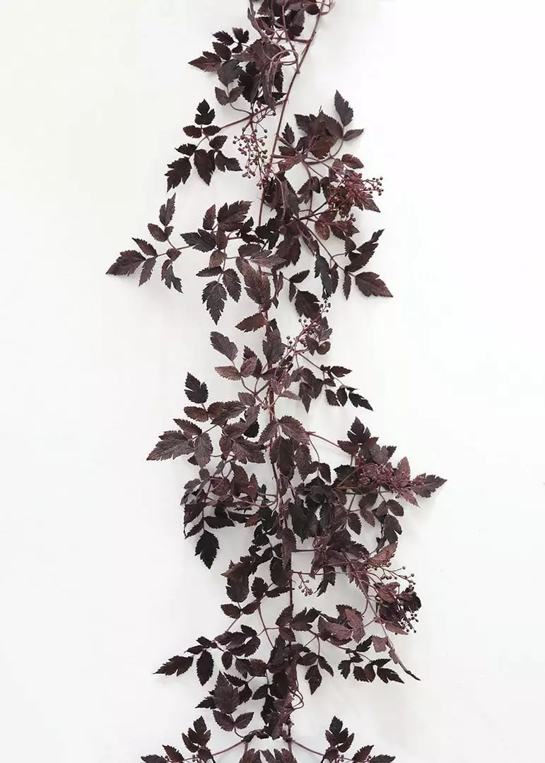 Add a nature-inspired look to your mantle centerpieces and wedding tablescapes for fall with this stunning plum purple artificial Cimicifuga Ramosa leaf garland. The incredibly realistic Hillside Black Beauty leaves have a dramatic, rich hue that complements any autumn color palette.