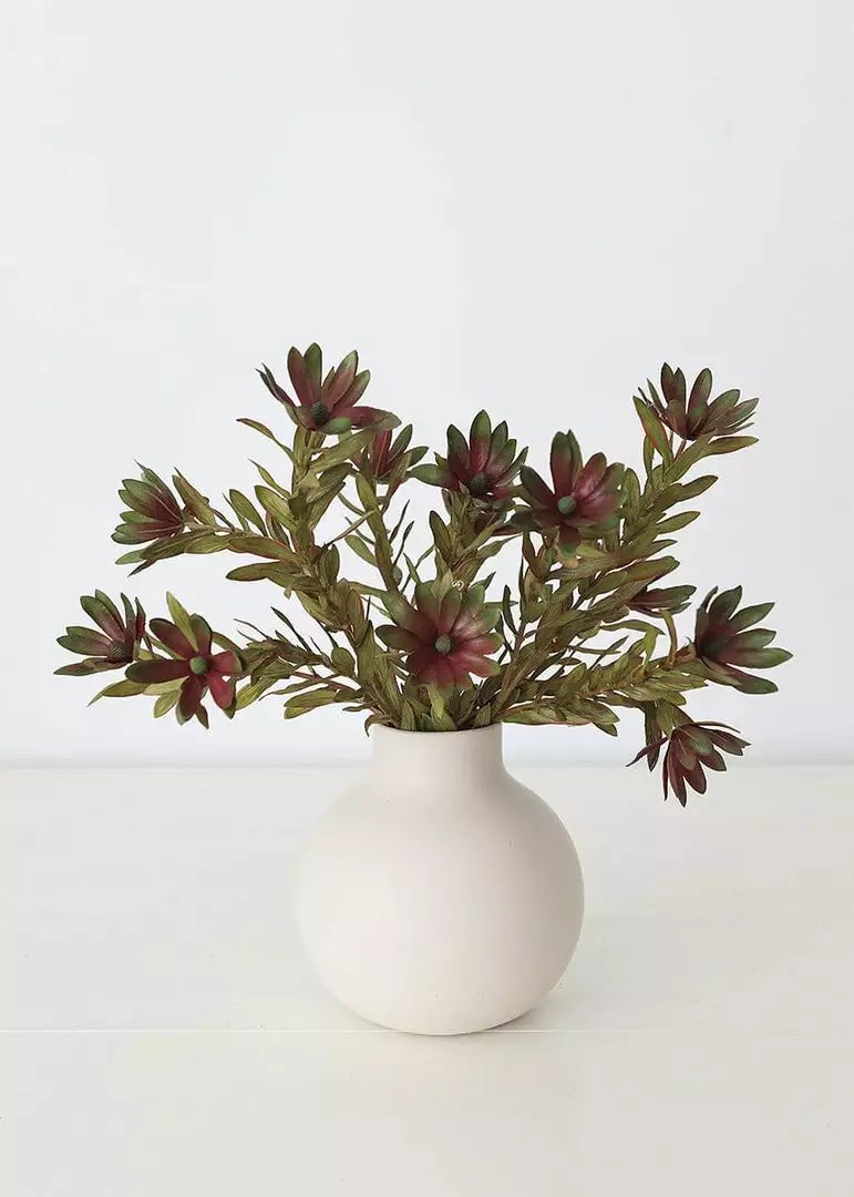 Add faux greenery to your tropical floral arrangements with this artificial wild protea flower foliage. The texture and the visual interest of these green and red burgundy leaves make them a stunning replica of nature. They are also a unique choice for holiday greens.