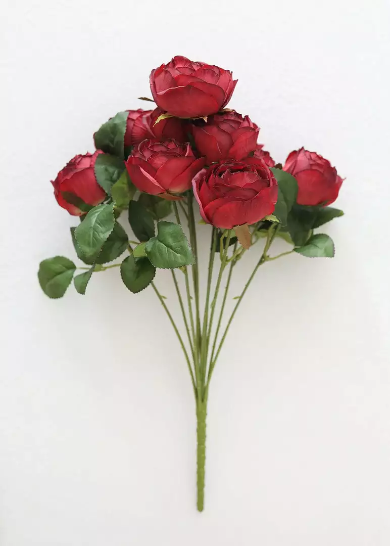 This gorgeous burgundy artificial rose flowers bush is just what you need for fall floral styling. Simply drop it in a vase for an easy but stunning centerpiece, or clip apart to add the fake roses to wedding flower bouquets.