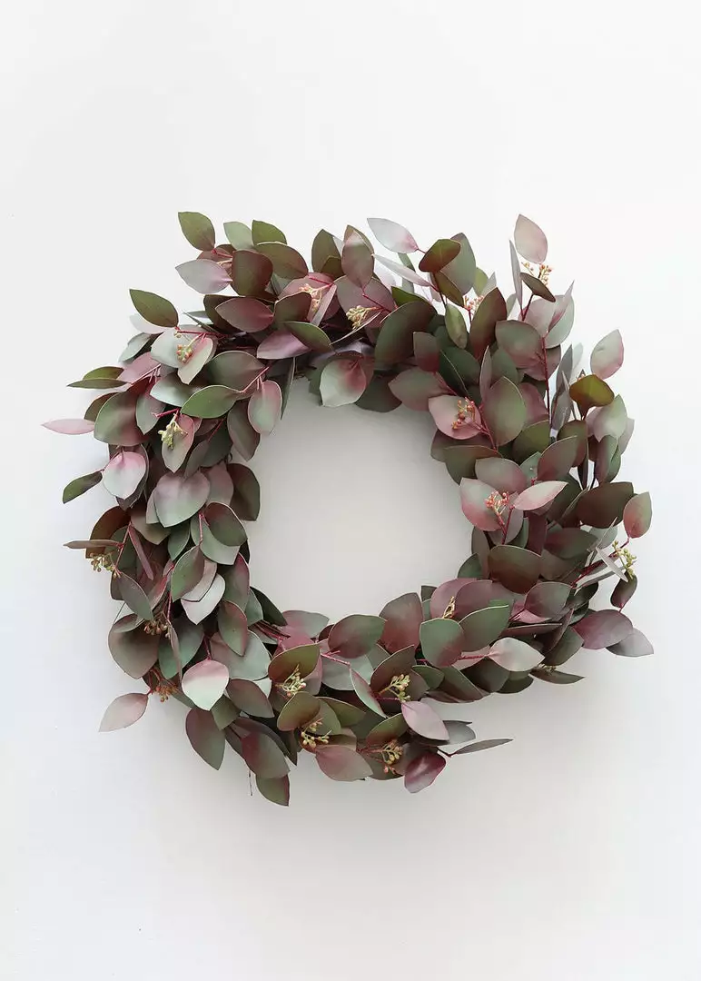 Find fake fall wreaths, like this striking burgundy and green artificial seeded eucalyptus wreath with real touch leaves. Whether you use it to decorate a door or a wall, this wreath is essential for autumn home decor.