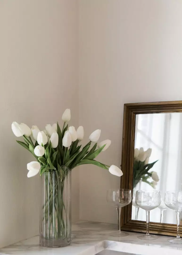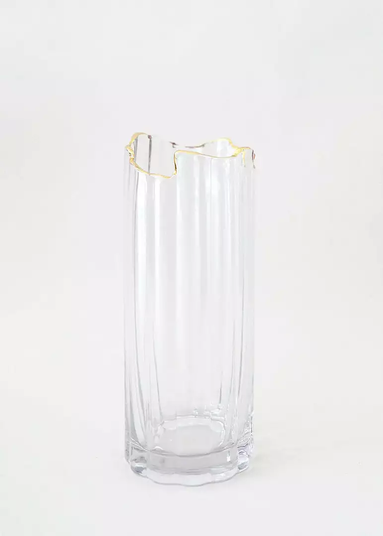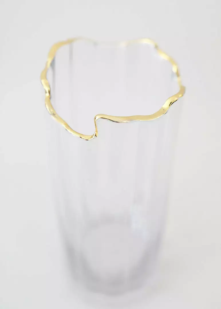 Inspired by the Gatsby era, this clear glass vase with a gold rim brings an understated elegance to any arrangement. With organic curves and a slightly ribbed texture, this glass vase adds dimension without overpowering. Simply drop a handful of artificial tulips inside and embrace an effortless, yet chic simple styling.