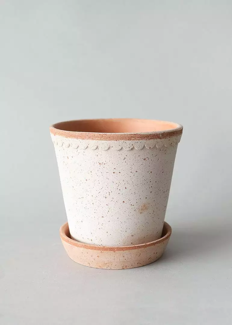 Bergs Potter’s pots have been carefully handcrafted to give your live plants the perfect place to grow. Incorporating time-tested techniques and classic design, the Helena planter is made for your indoor and outdoor gardens. Saucer included. Each planter is handmade and will vary slightly. NOT Frost Proof, store inside during winter months. Whitewash terracotta clay is porous, color will darken when saturated with water.