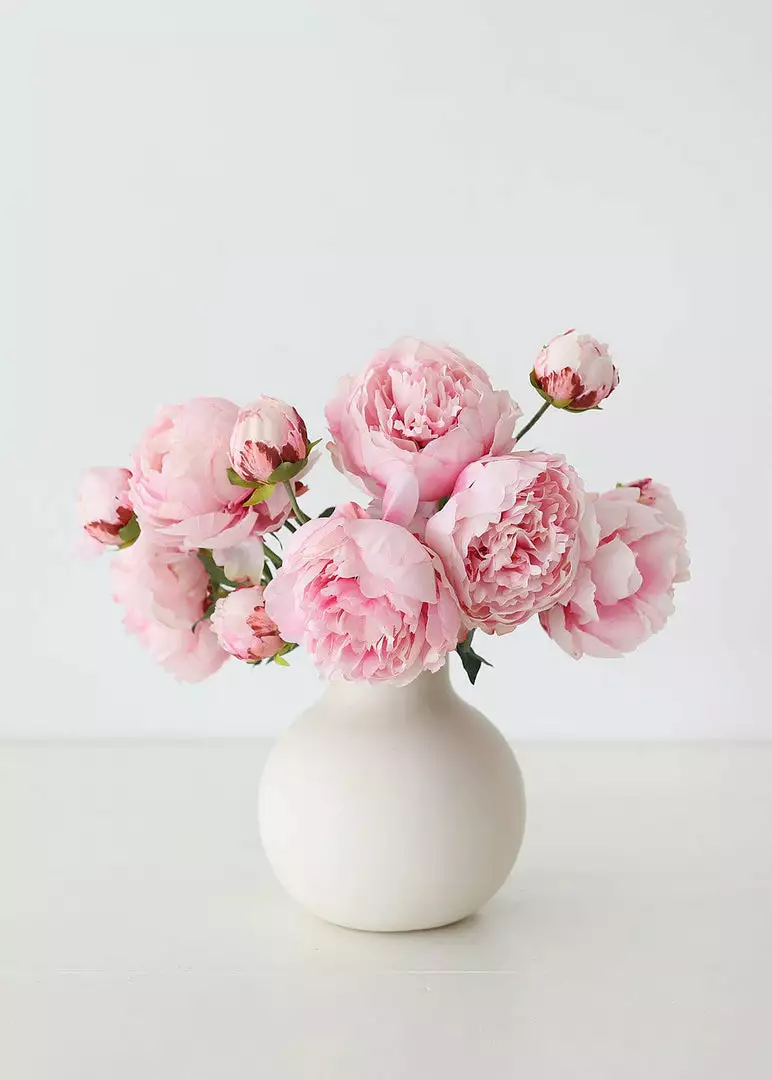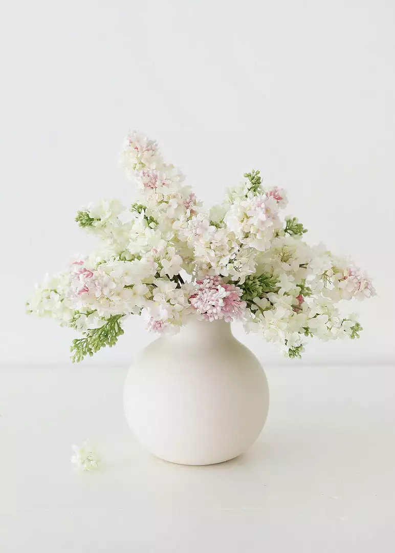 Find a neutral yet stunning round creamy white ceramic vase. Add faux florals or dried stems for a chic look.