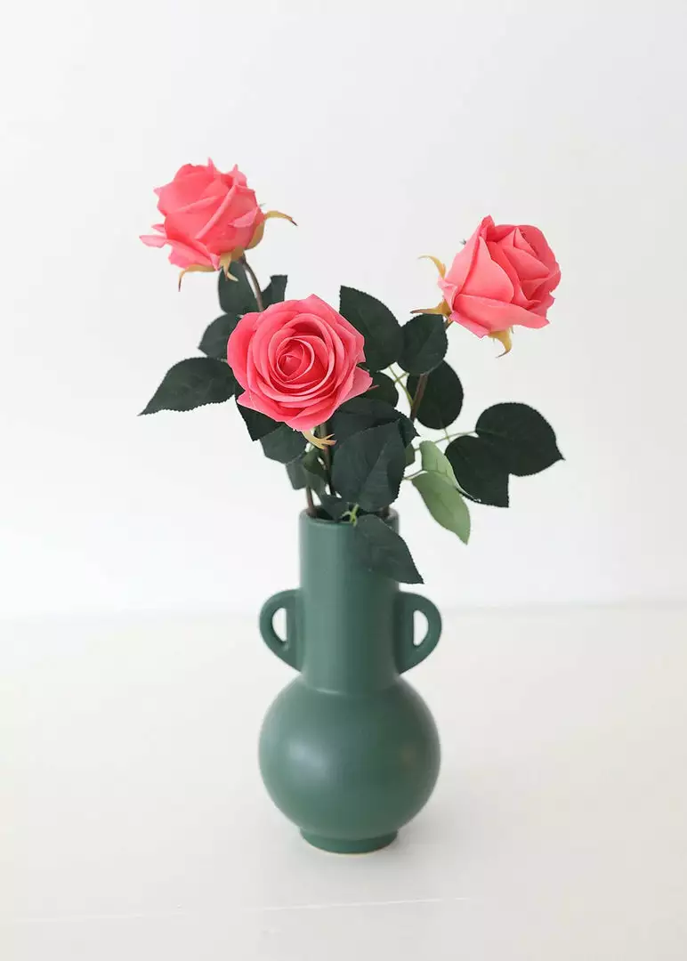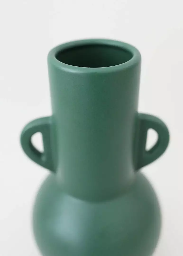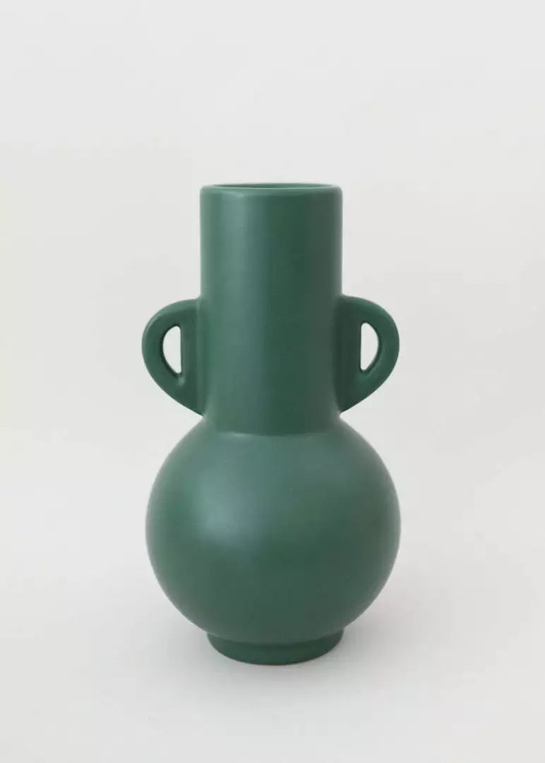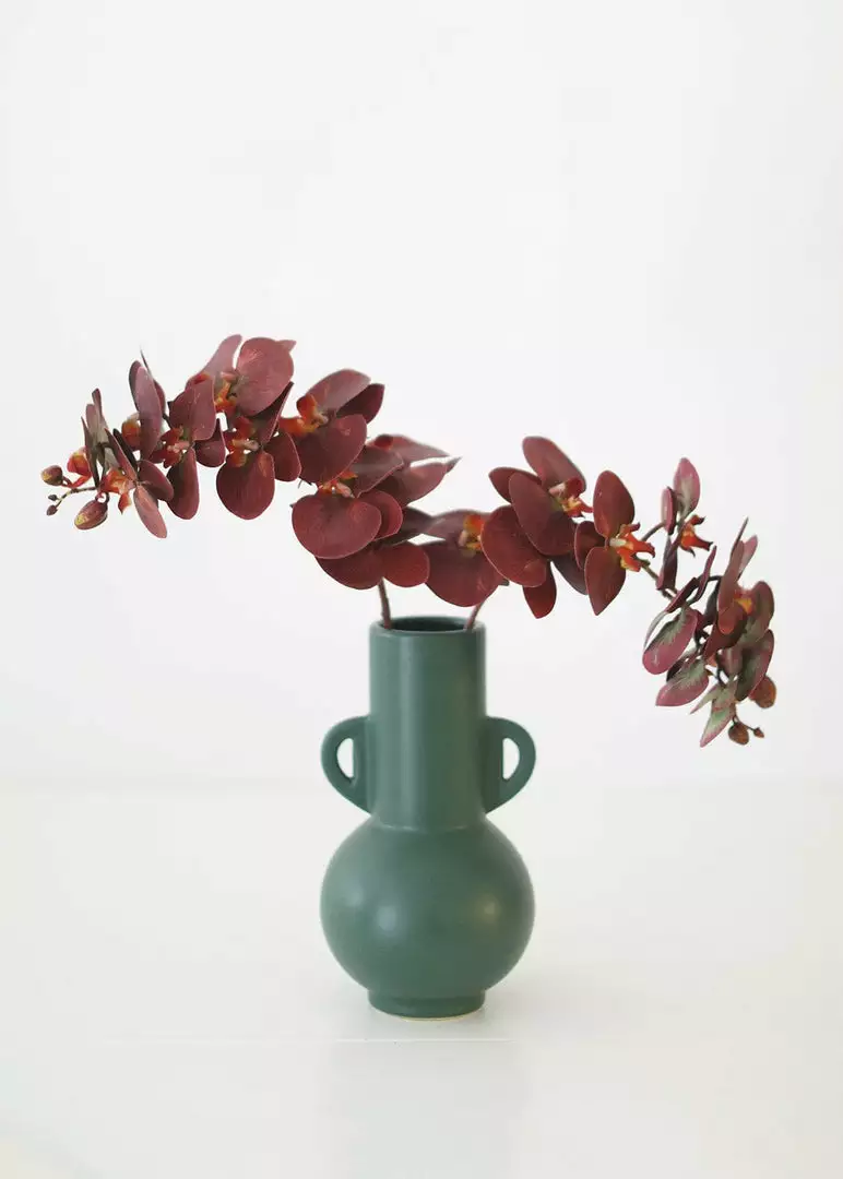 Find trendy vases for your home decor like this dark green ceramic vase with handles. It’s the perfect statement piece to showcase a bold and colorful flower arrangement.