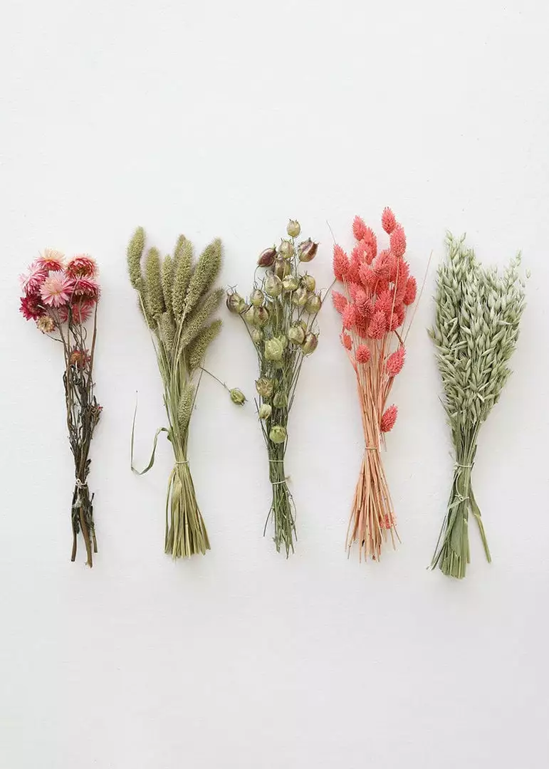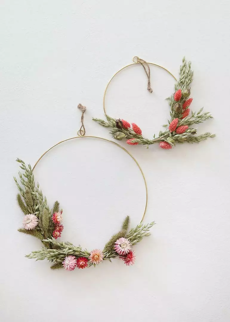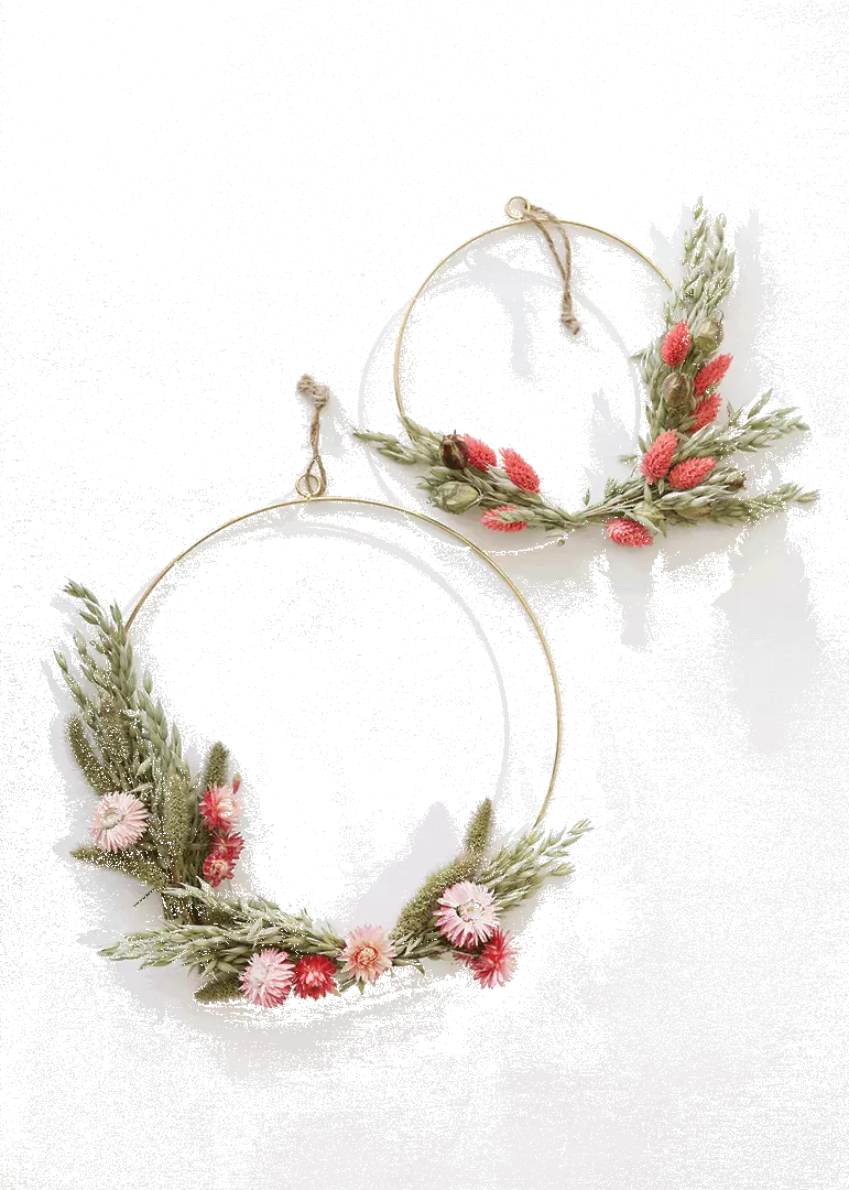 Design beautiful, dried floral hoops easily with this handy styling kit that contains everything you need! The kit includes 2 gold hoop rings, green floral wire, dried green and purple nigella, pink helichrysum everlastings, green oats, green phalaris grass, and green setaria foxtail millet. These natural flowers and grasses grew on a sustainable flower farm in the Netherlands. Naturally beautiful flowers and grasses are unique.