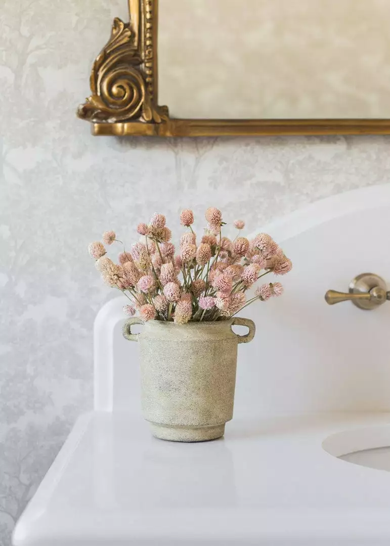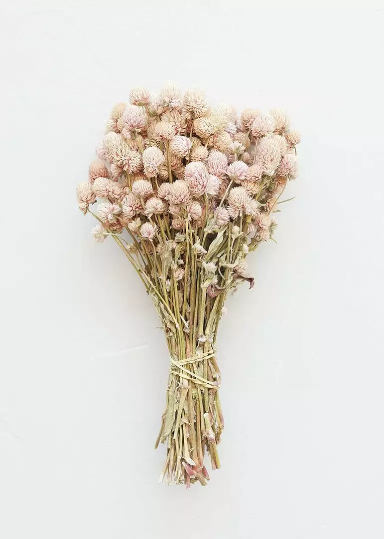 Each hand-gathered bundle of soft pink dried globe amaranth flowers are hand-harvested and naturally dried on a small flower farm in the northwest and are now brought to your home.