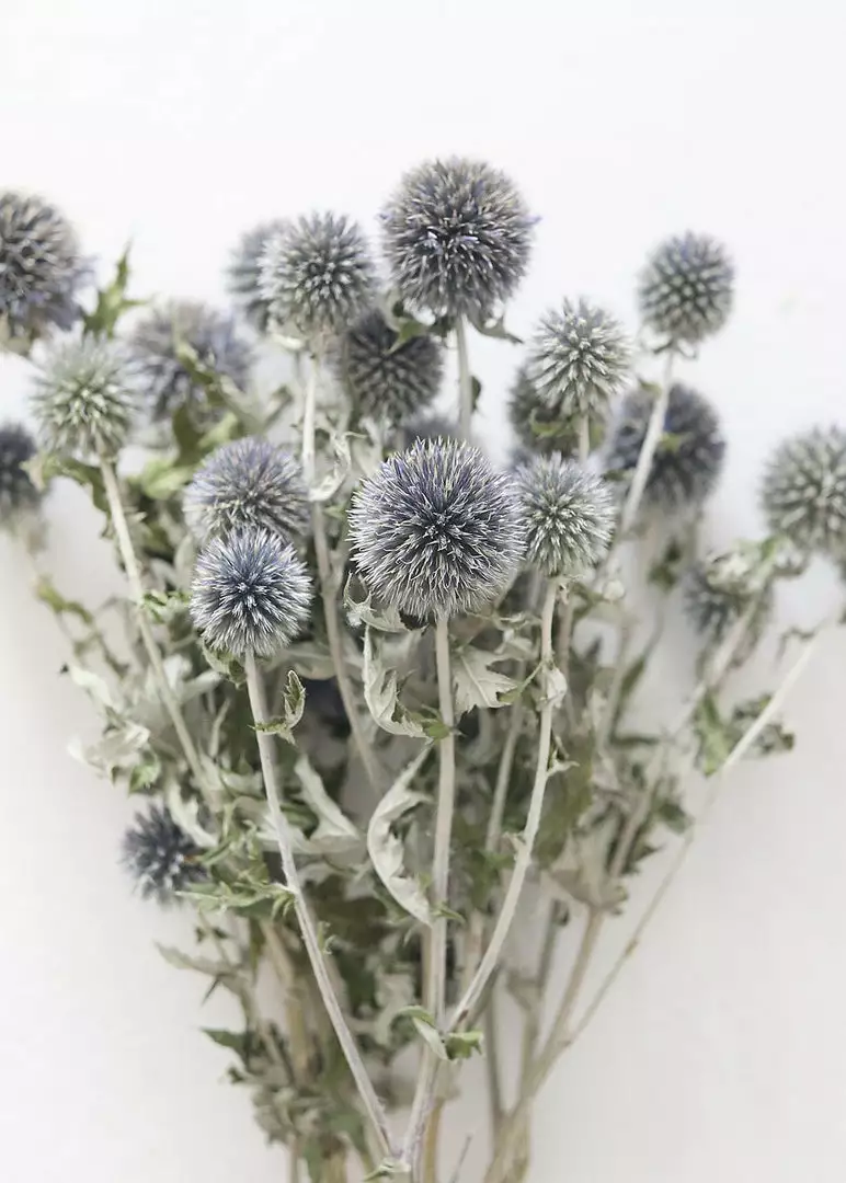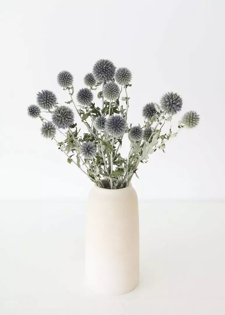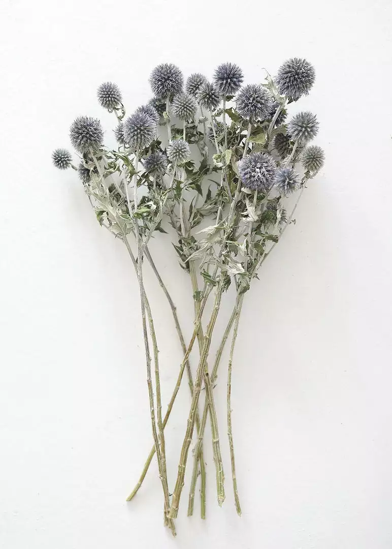 Harvested by hand on a small, sustainable flower farm in Washington, these natural, dried globe thistles bring the feeling of nature into any home. Arrange a single stem in a bud vase or style the whole dried flower bundle together for a whimsical design, reminiscent of late summer days and waving fields of florals.