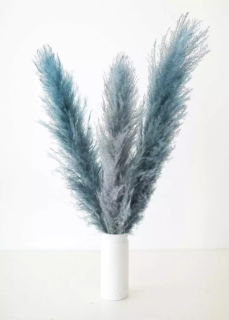 Find natural grasses in trendy colorful hues, like this beautiful blue grey dried pampas grass. It’s the simple approach to creating a chic vase arrangement for any side table in your home. This product will shed, gently shake outside to loosen grass