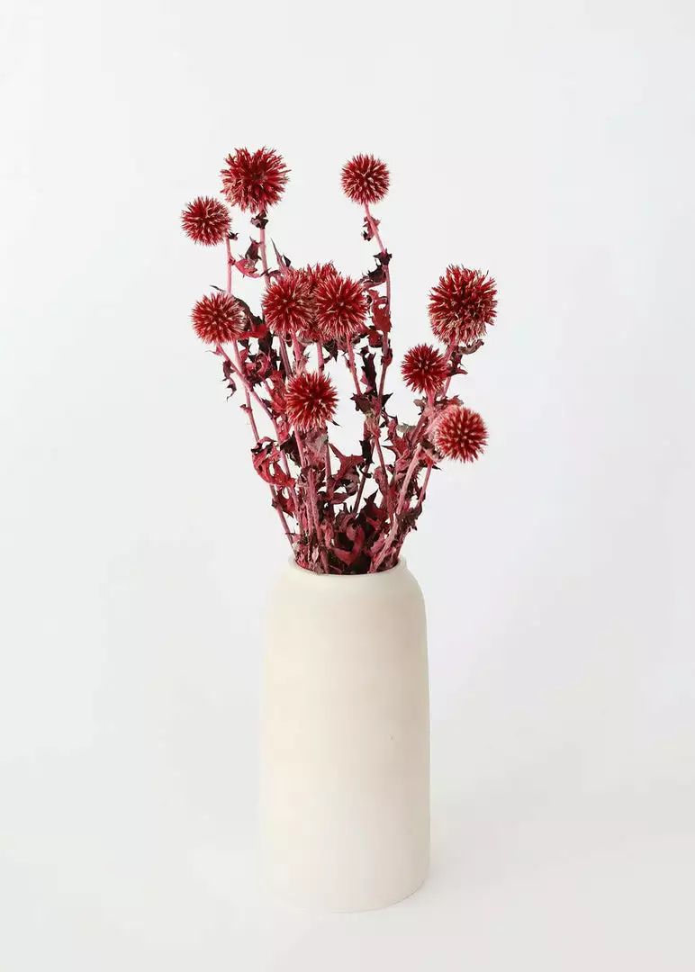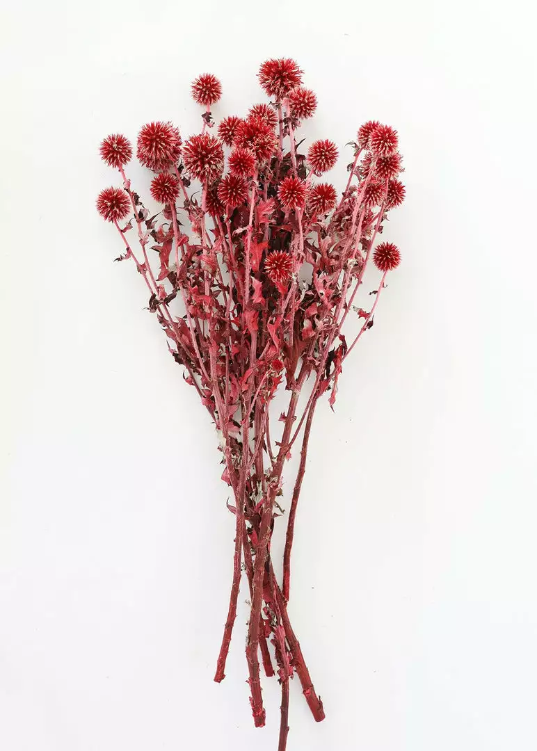 Add a touch of texture to your dried flower arrangements with red burgundy dried echinops thistle flowers. Delicate and funky, these red dried thistle flowers are perfect styled alone in a bud vase or tucked into a dried flower arrangement for extra depth and dimension. Dried and preserved items may arrive with a slight odor, allow to breathe for 5-7 days in a well-ventilated area.