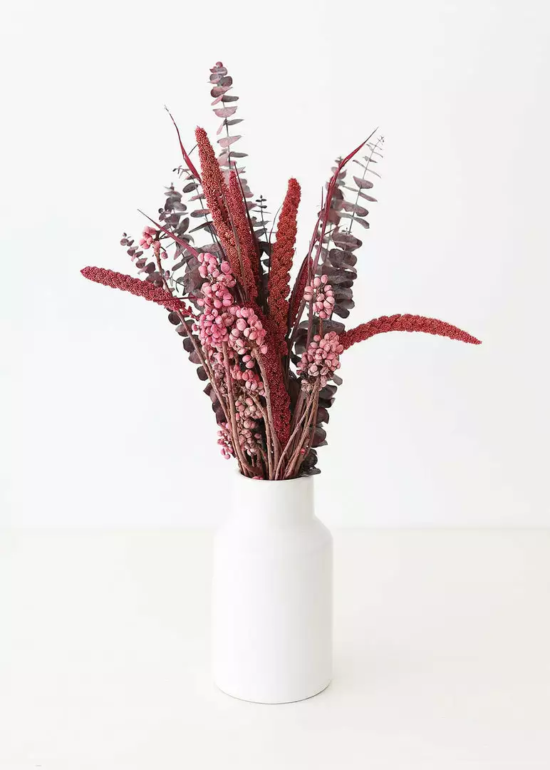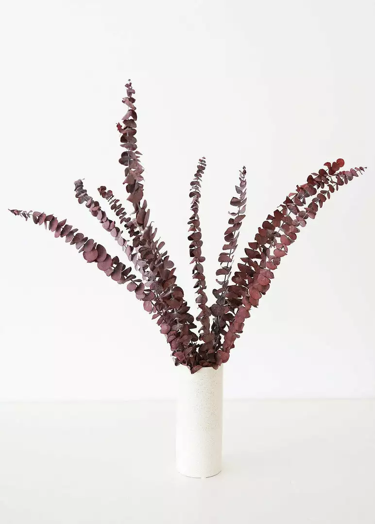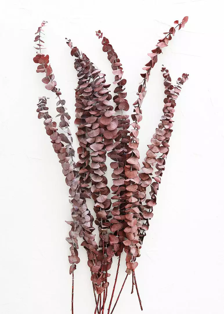 Find natural greenery for your home, like this stunning burgundy preserved spiral eucalyptus bundle. Simply style the leaves in your favorite tall vase to create a fresh look that lasts, or add to dried fall flower arrangements.