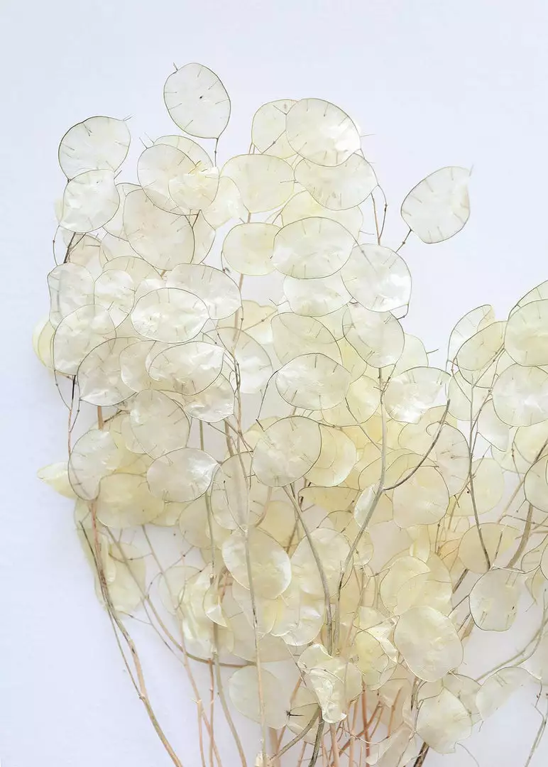 Achieve clean, sophisticated home vase decor or wedding centerpieces with these natural dried lunaria silver dollar branches. They give your design perfect coastal vibes and nature’s touch of whimsy. Natural product, each bundle is unique and color can vary from cream to yellow or a mixture of both.