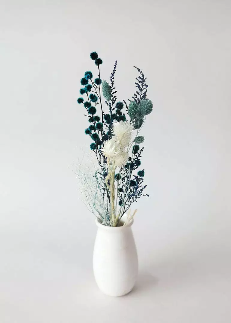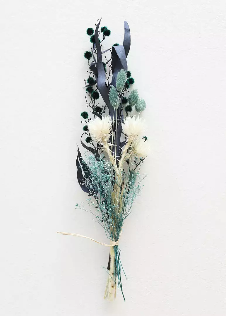 Stunning teal blue petite bouquet is the perfect addition to elevate your home decor with nature’s beautiful botanicals. This dried flower bouquet features dyed phalaris grass, dyed eucalyptus, bleached everlastings, and dyed gyp flowers.