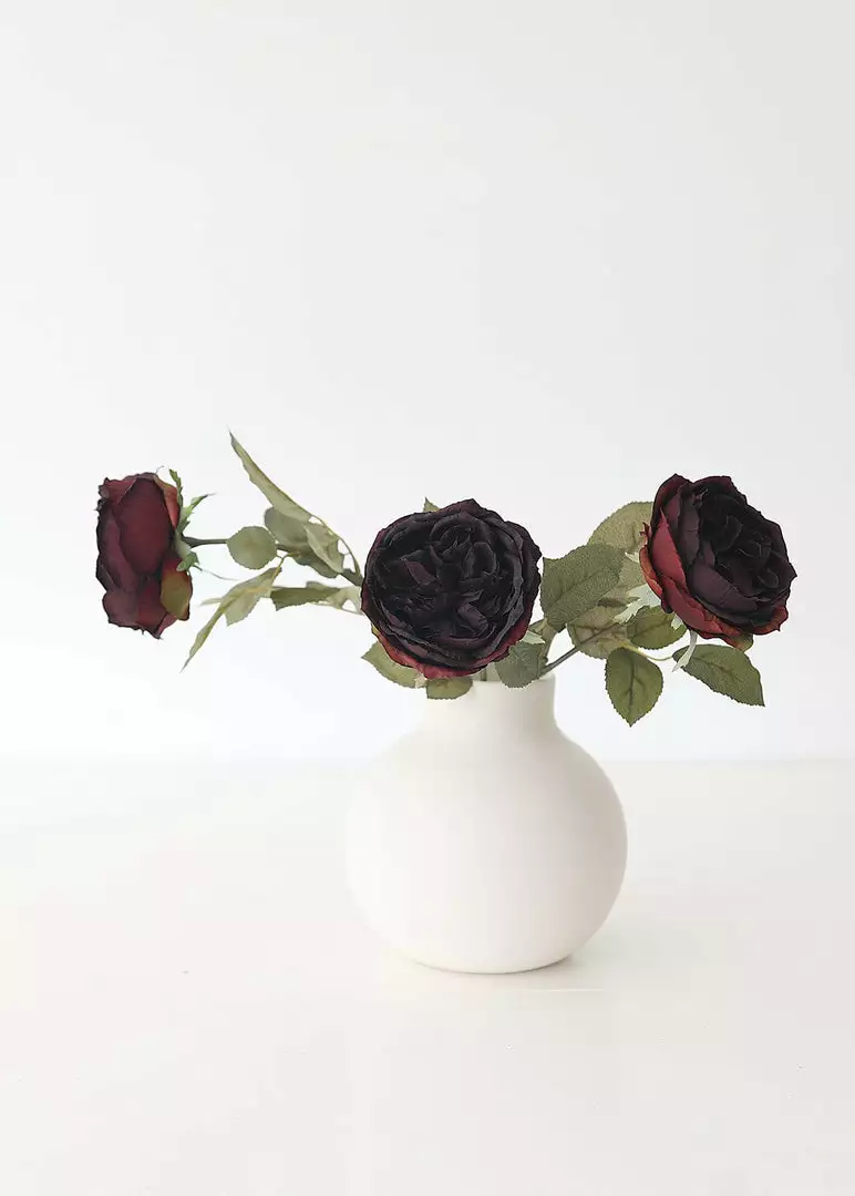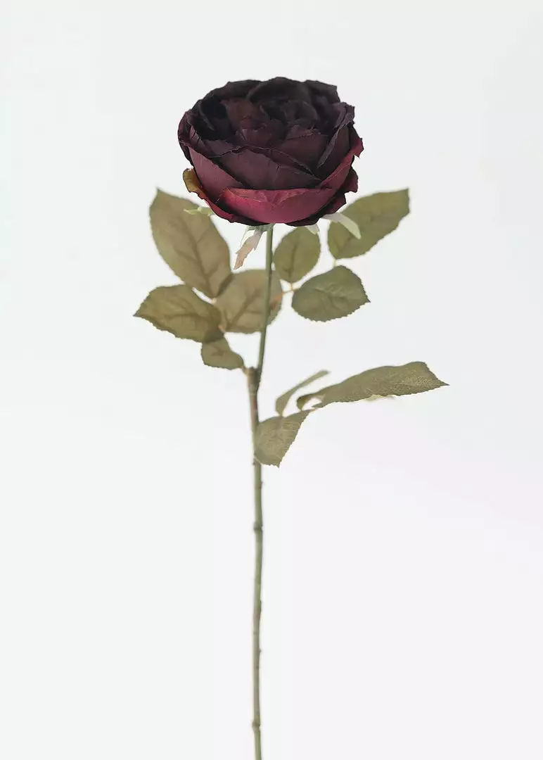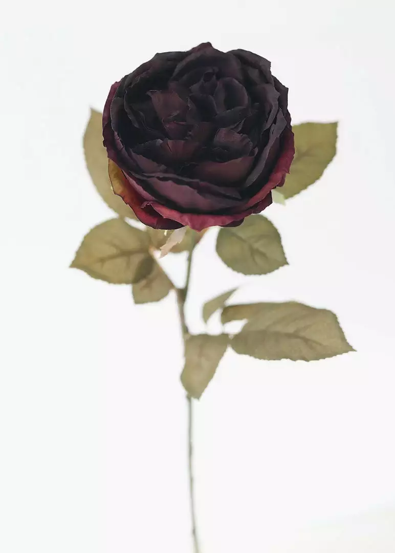 Looking for fake roses in rich fall colors? Your fall wedding flower bouquets and autumn vase decor are not complete until you add this striking English cabbage cupped rose silk flowers stem in plum eggplant with burgundy tones.