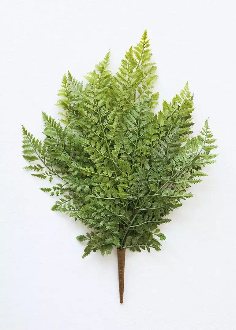 No green thumb, no problem. This no-maintenance artificial lace fern is UV-protected, perfect for brightening your indoor or outdoor spaces all year round. The real-touch leaves offer several tones of greens ranging from serene sage notes to brighter ripe avocado hints. Simply plop the base stem in your planter of choice and fluff out the partially wired inner stems.