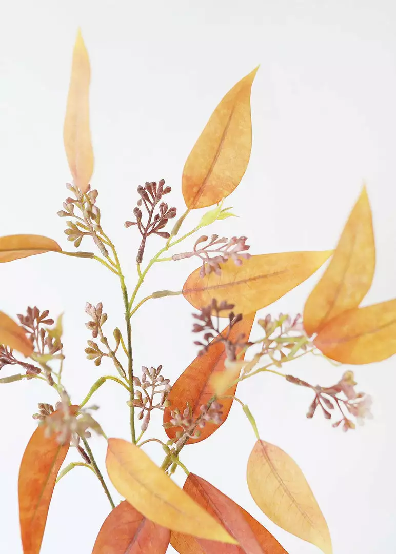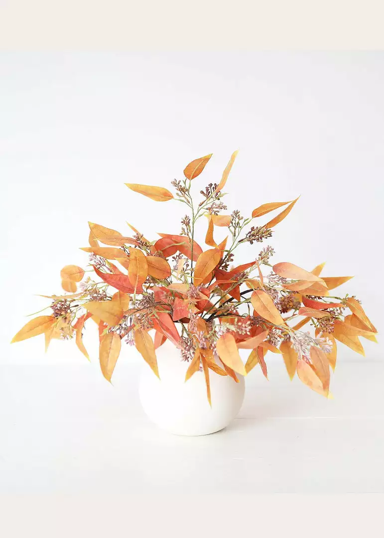 Styling with silk artificial fall leaf stems is a simple approach to decorating your home for autumn. Add these fake seeded eucalyptus leaves to floral wreaths and vase arrangements to showcase the beautiful, warm terracotta orange and mustard yellow hues inspired by nature.