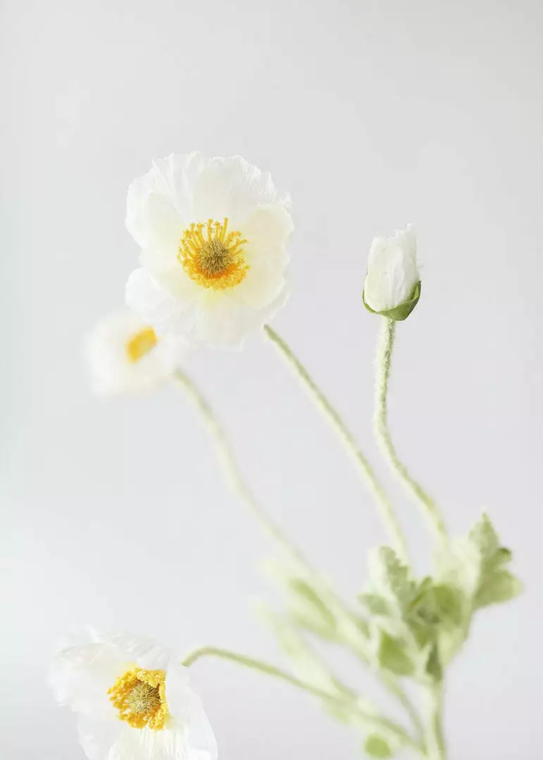 Your faux summer floral arrangements and wedding flower bouquets call for playful poppies! These white artificial poppy wildflowers have ultra-realistic petals, flocked green leaves and stems that make them a beautiful replica of nature.
