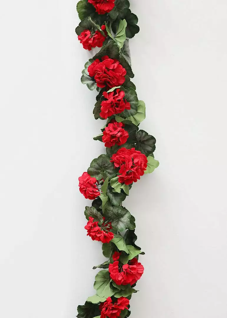 Nothing gets better than no-maintenance outdoor flowers, so freshen up your outdoor seating area with a vibrant red UV-protected geranium garland. The fluffy red geranium clusters are UV protected and pop against the lifelike textured geranium leaves. Hung on a two-toned durable plastic-coated wire stem, this artificial geranium garland is perfect for hanging season after season.