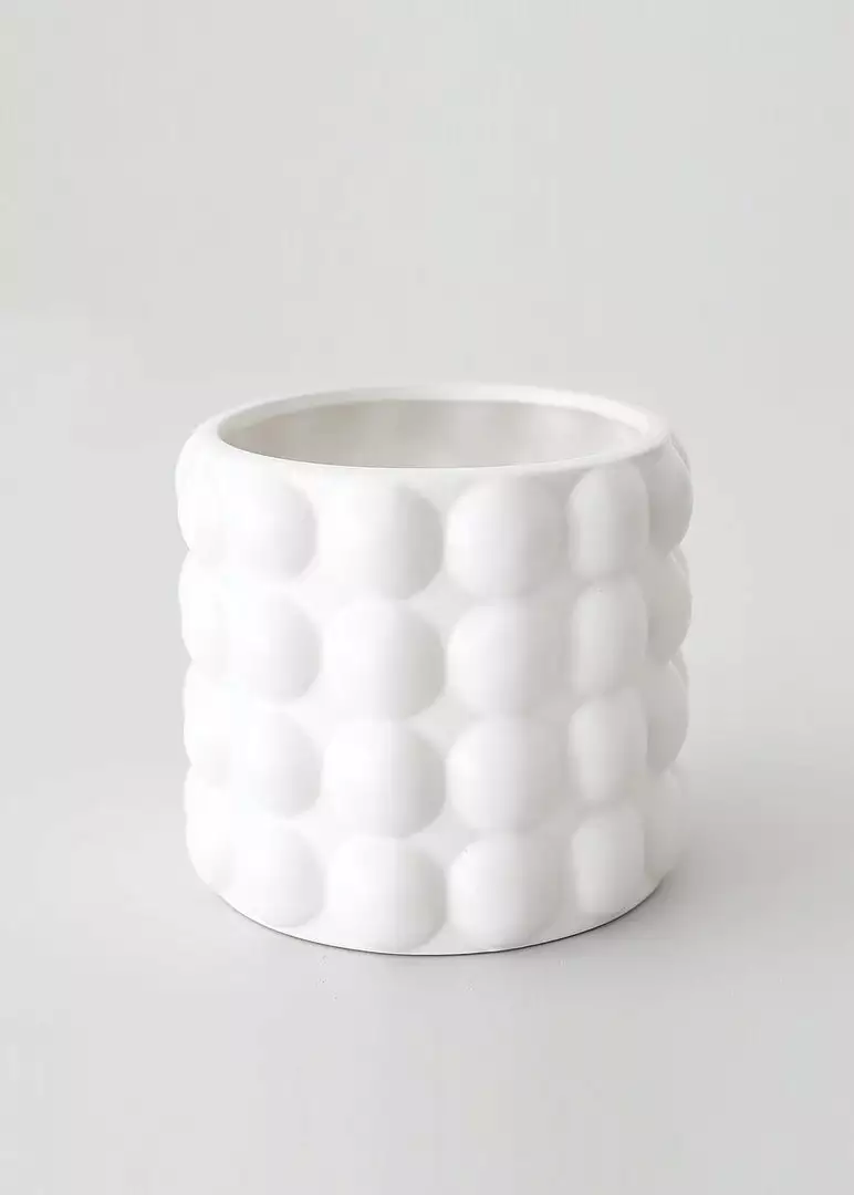 Elevate your decor with unique planters like this matte white ceramic textured pot from the Bubble Collection. The large hobnail knobs add character, making this pot a chic home for your plant. NOT Frost Proof, store inside during winter months.