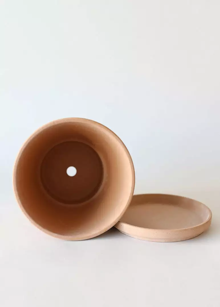 Find indoor/outdoor planters that have drainage, like this terra cotta clay pot with a saucer from the Earthen Collection. It’s the perfect home for your house plant.