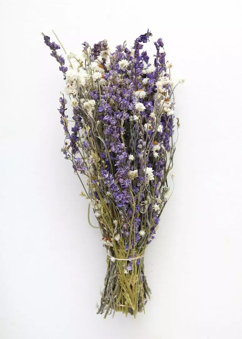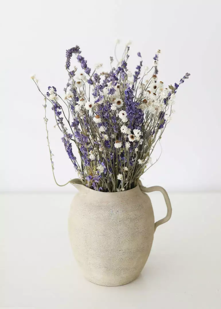A true botanical beauty that invites the feeling of nature into your home, this stunning bouquet of dried florals features lavender purple larkspur wildflowers and white mini daisies. The best part? It’s vase ready! These naturally beautiful and unique flowers were grown and arranged on a small flower farm in Mexico.