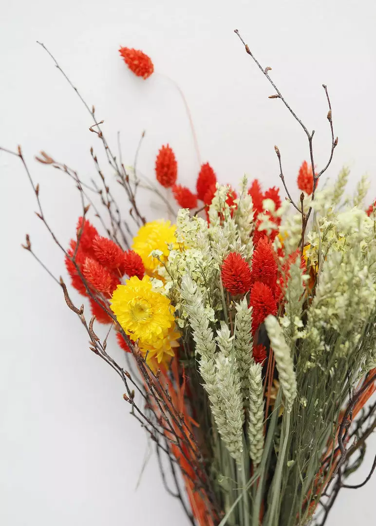 Invite nature’s beauty into your home with this striking, bright orange and yellow floral bouquet of colorful dried botanicals. Featuring everlasting daisies, phalaris grass, triticum wheat, and oats, the natural flowers in this hand-arranged bouquet were grown, dried, and dyed with eco-friendly, water-based dyes on a sustainable flower farm in the Netherlands.