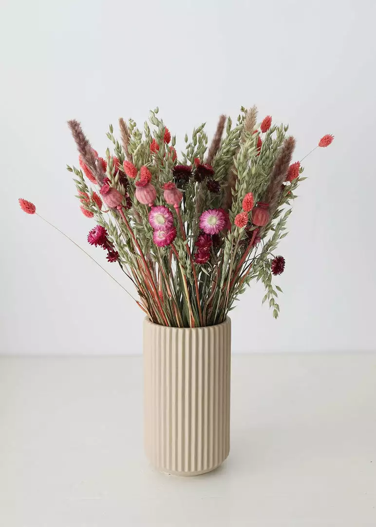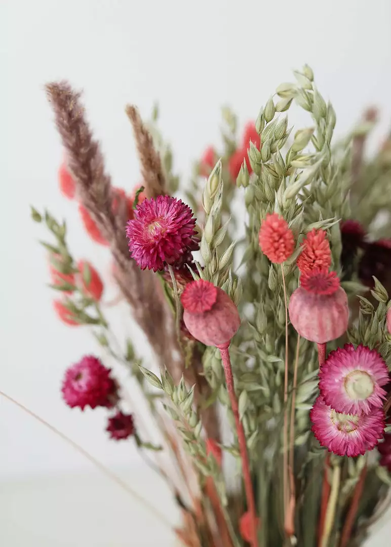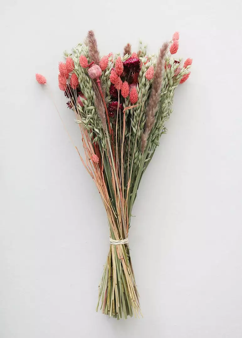 The perfect centerpiece does exist. This colorful pink and purple dried flower bouquet was grown and arranged on a small, sustainable farm in the flower capital of the world, the Netherlands. This artful arrangement perfectly balances warm and cool tones with natural and water-based dyed florals including phalaris, oats, and everlastings.