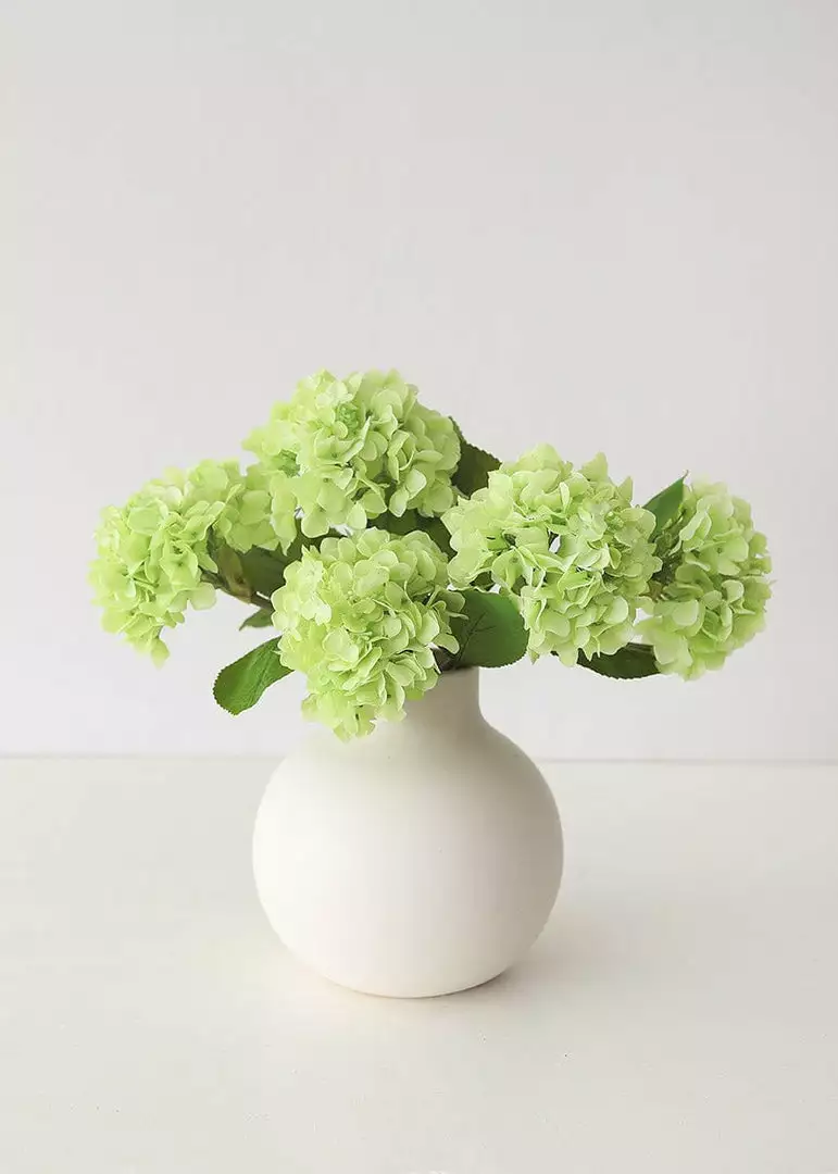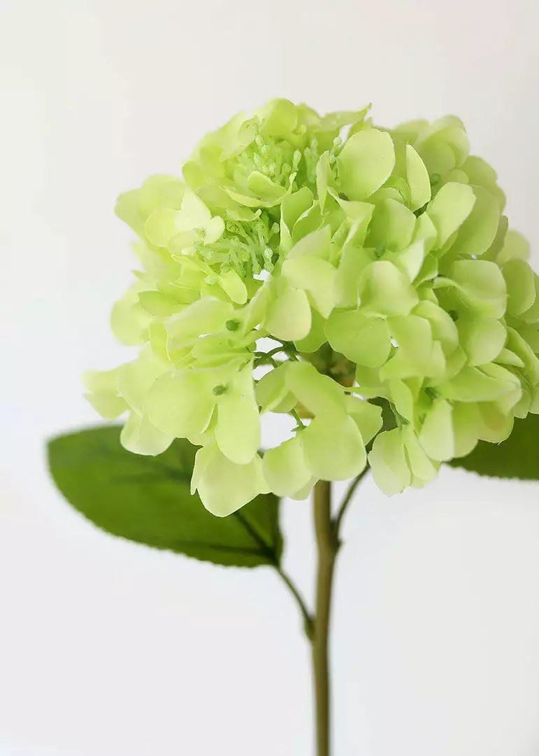 These faux hydrangea blooms feel as real as they look, featuring natural-touch petals. Their coloring offers lively hints of lime and subtle yellow tones, reminiscent of young hydrangea blooms in springtime.