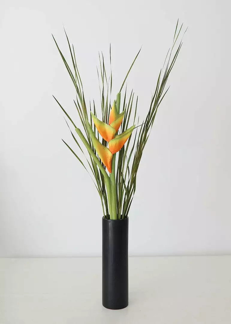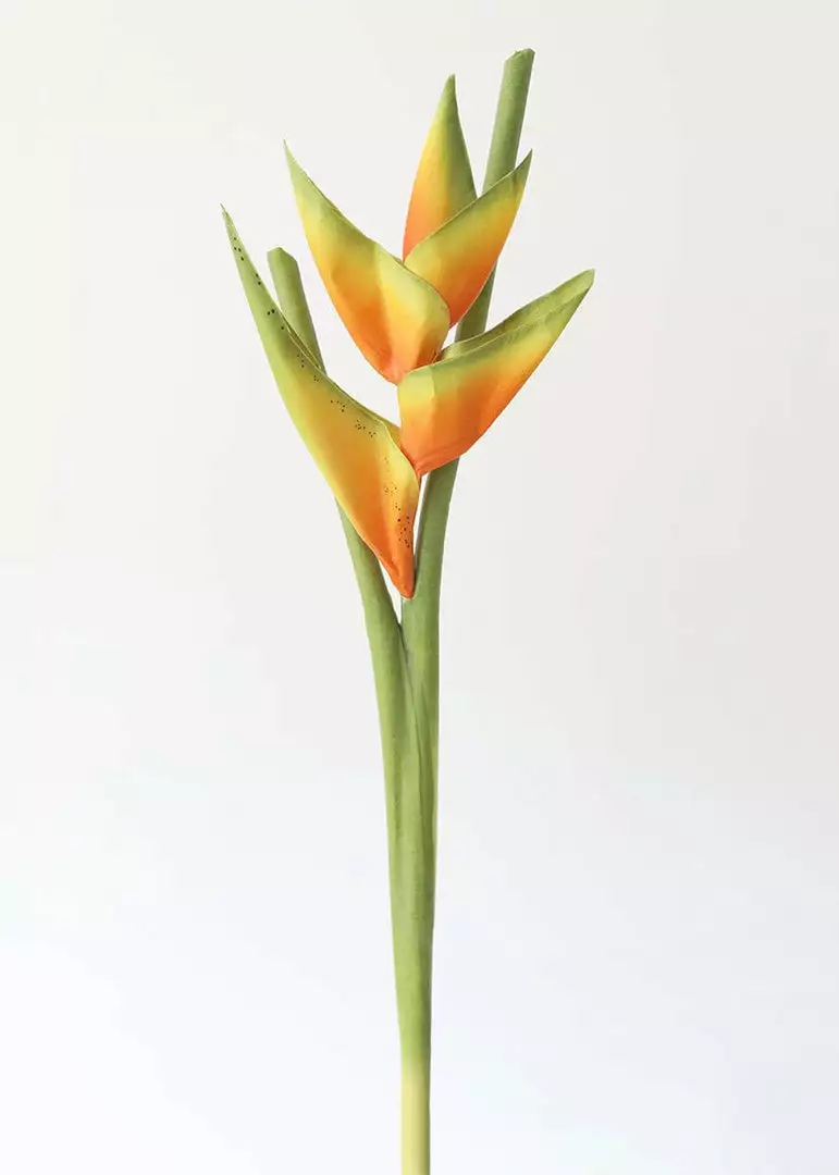 This gorgeous orange and green heliconia flowers stem is a striking example of artificial Hawaiian botanicals. Simply style it in your faux tropical flower arrangement to create an elevated exotic design.
