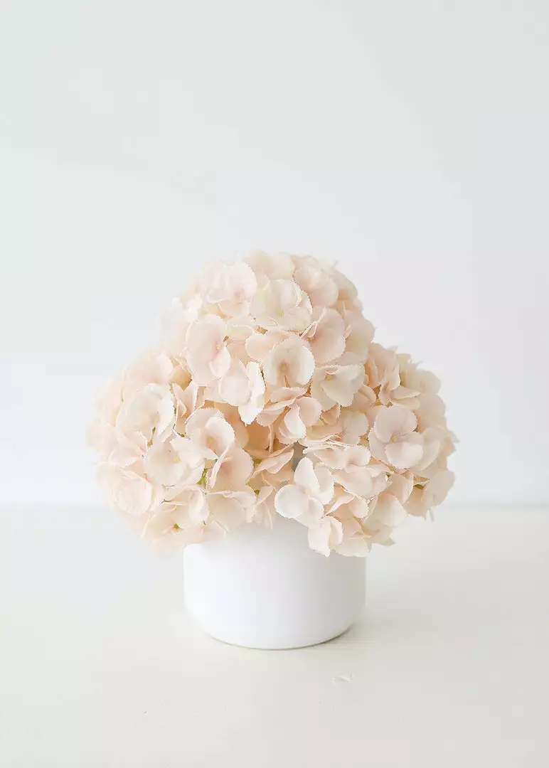 Make a statement with oversized artificial flowers, like this lovely soft blush pink hydrangea stem with a jumbo silk bloom. You just need to style it in your favorite bud vase to complete a fresh, trendy look.
