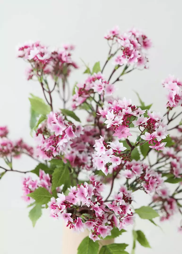 These star-shaped filler flowers are a firecracker of color for your wedding bouquets or special occasion arrangements. This pink artificial bouvardia flower branch shows off its ombre-like petals showcasing the deep lavender-pink of the center into a gradient of cream white around the edges. Add some romance to your wedding bouquet or floral centerpieces and pair with off-white roses or smoky lavender accents.