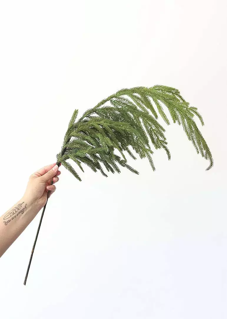 Create amazing Christmas centerpieces with this faux Norfolk pine branch that features the most realistic artificial holiday greens. Soft-to-the-touch pine sprigs in natural green color perfectly mimic the feel and the look of nature. Style this spectacular greenery in your tall woodland vase arrangements, winter wedding bouquets, and boutonnieres. Even make a stunning 6-foot garland using 3 branches.