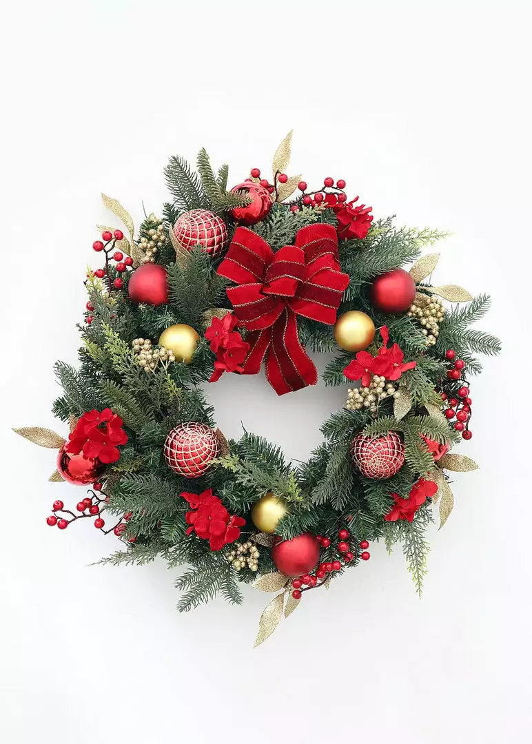 Find artificial Christmas wreaths, like this festive pine wreath. It’s decorated with red and gold accents including ball ornaments, glittered fake berries and leaves, and small flowers. The red velvet ribbon completes the look.