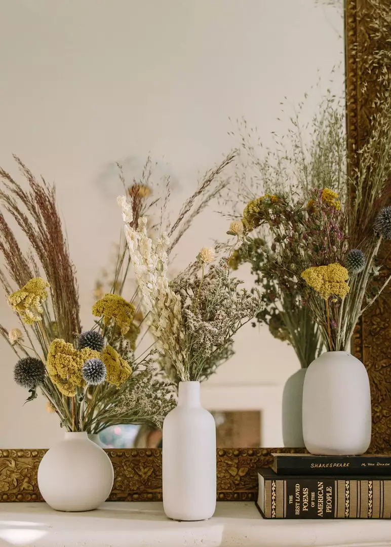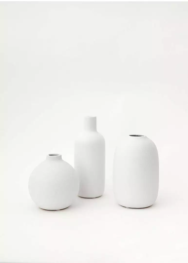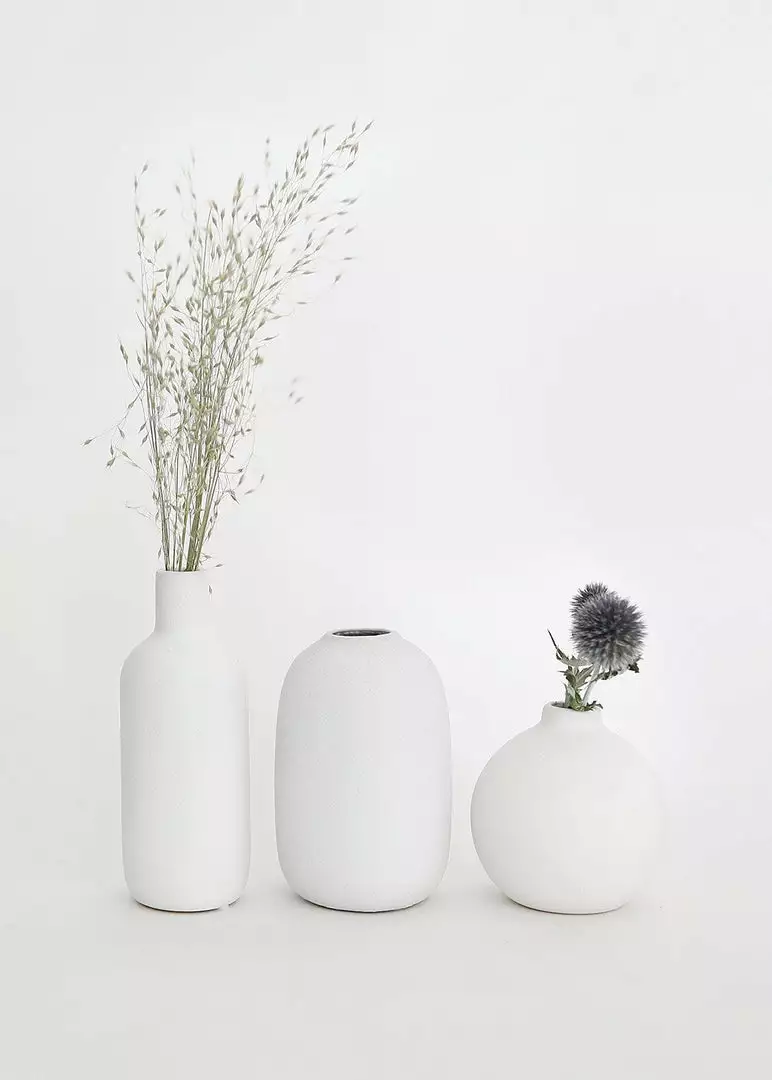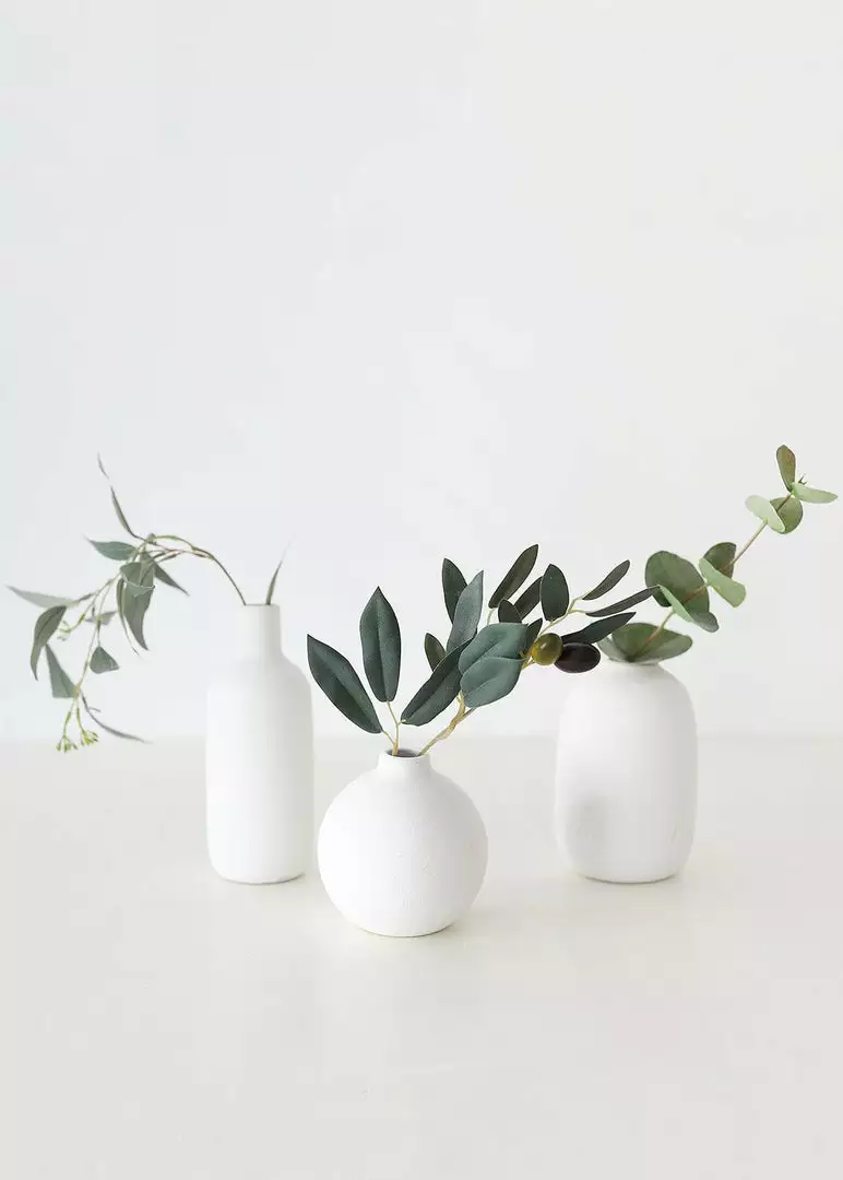 Find flower vases in different sizes for home tabletop and shelf styling, like this set of matte white ceramic bud vases in bottle, oval, and round shapes. Simply use a mix of artificial and dried stems to create your unique designs.
