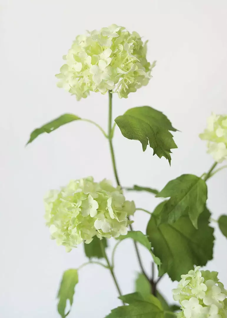 This stunning soft green artificial snowball spray has large flowers that look like hydrangeas. Style the fluffy blooms in a vase arrangement to create a simple but elevated high-end design that welcomes the feeling of nature.