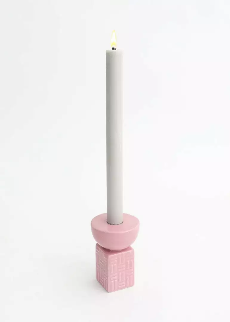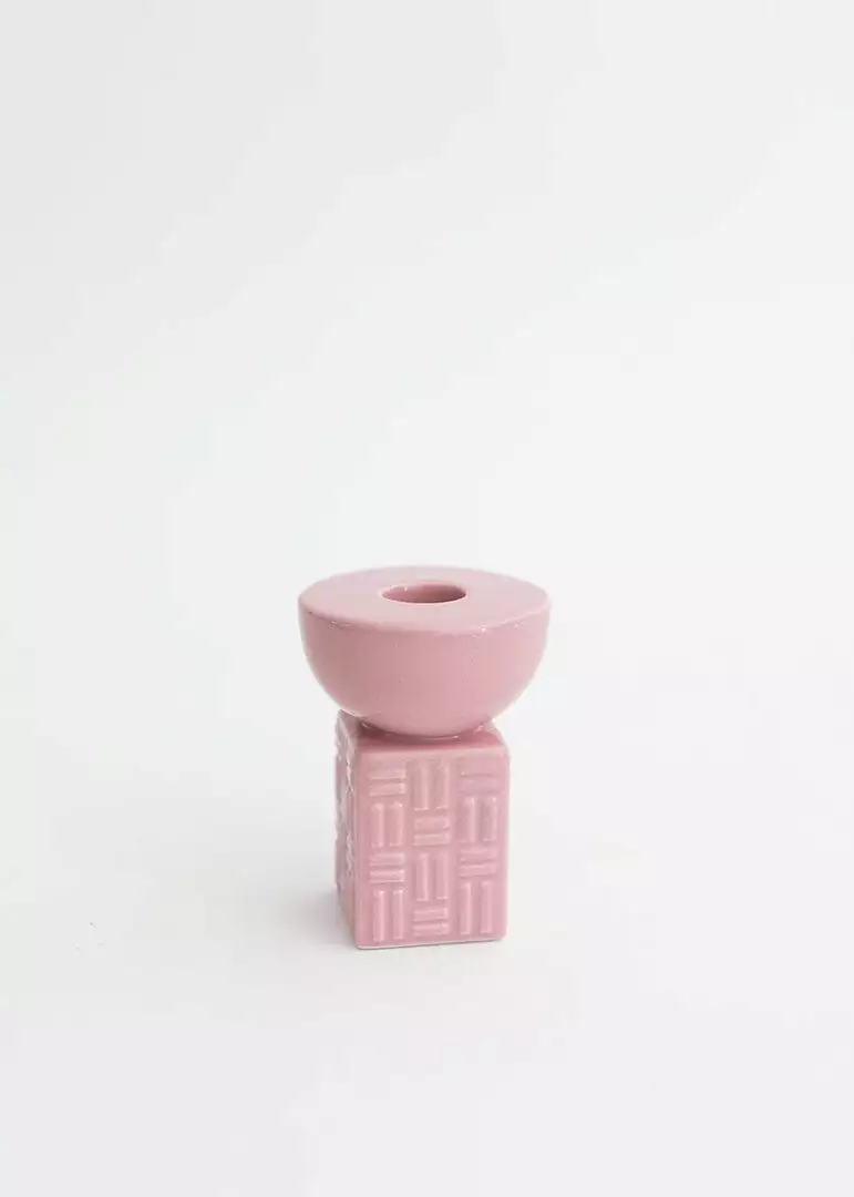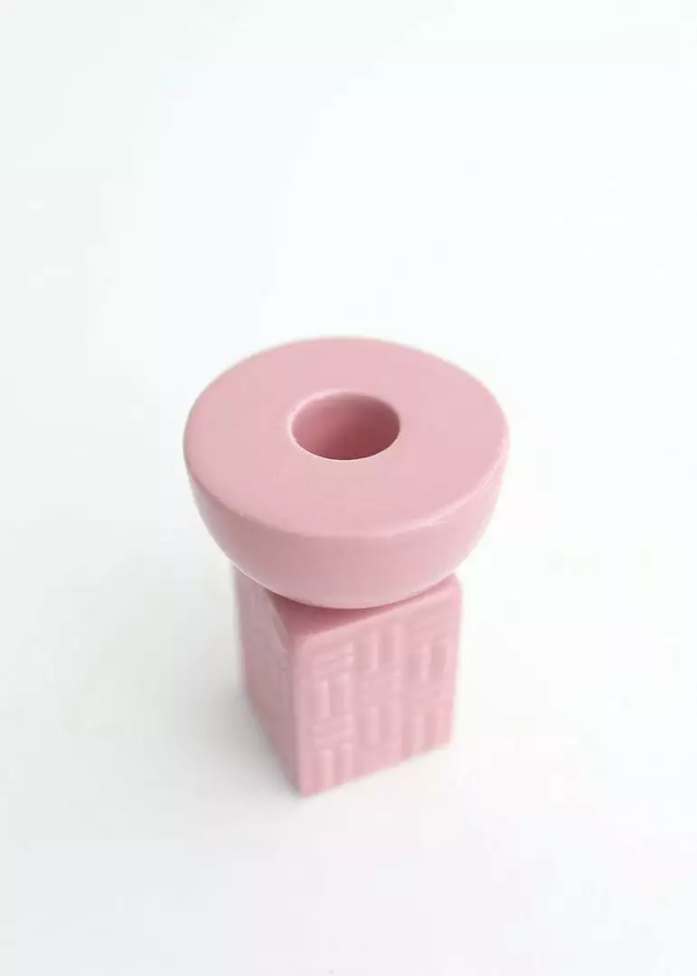 Need ceramic candlesticks for home table decor and wedding tablescapes? Enhance the look of your modern centerpieces with this small, playful pink dolomite stacked taper candle holder with a textured geometric pattern.