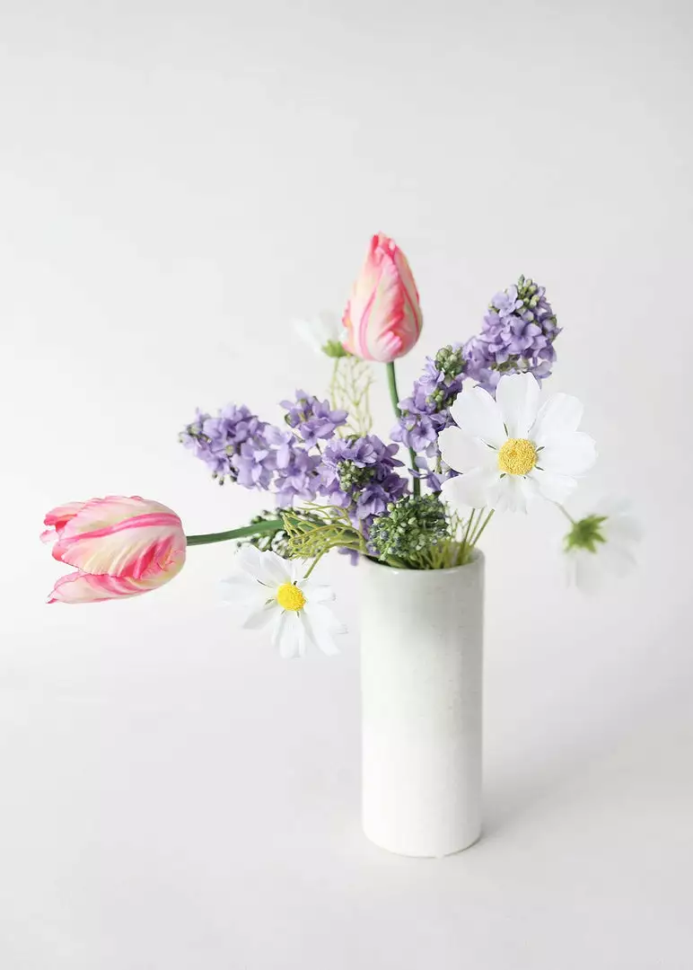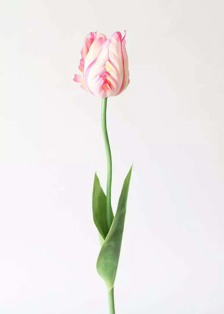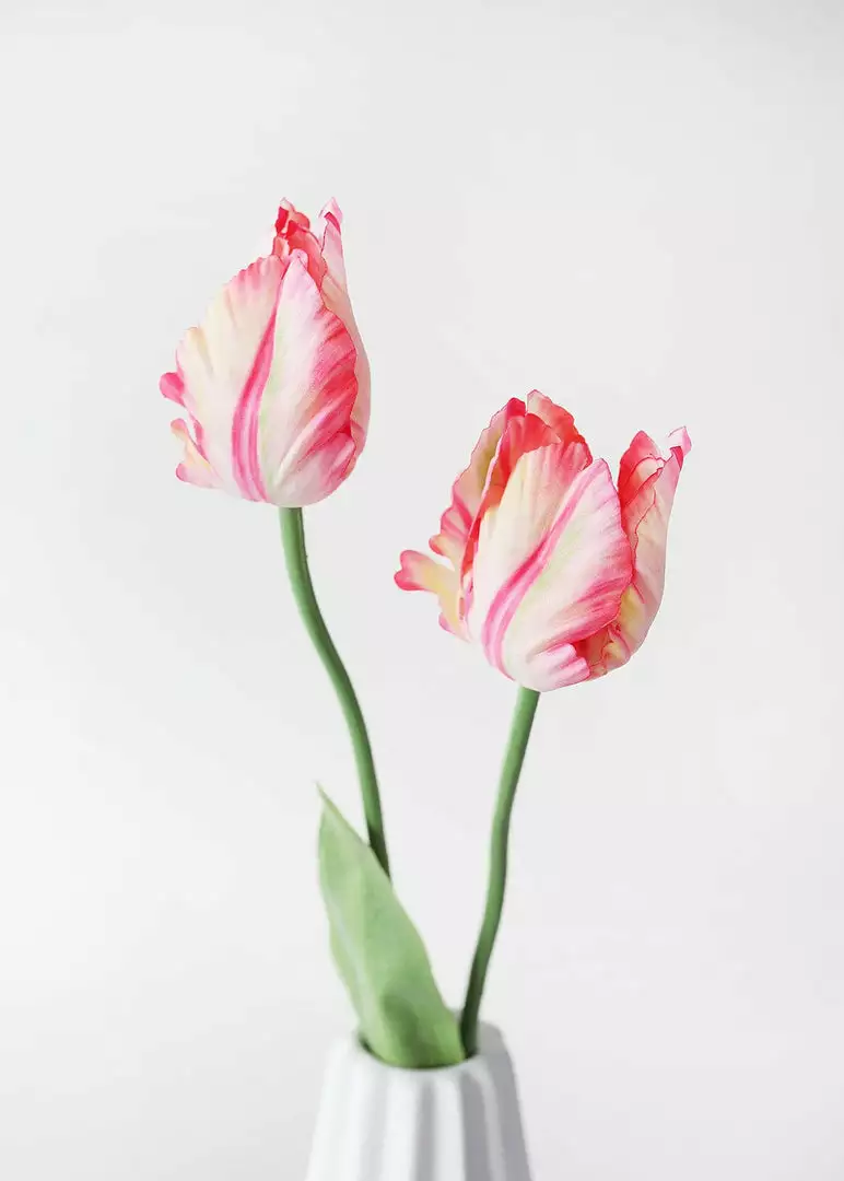 Try long-lasting, colorful faux flowers to easily brighten your home for spring, such as this pink and cream parrot tulip with yellow highlights. The vibrant variegated coloring of these artificial tulips makes any vase arrangement pop.