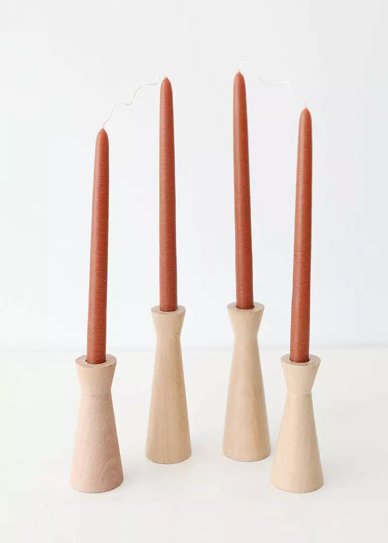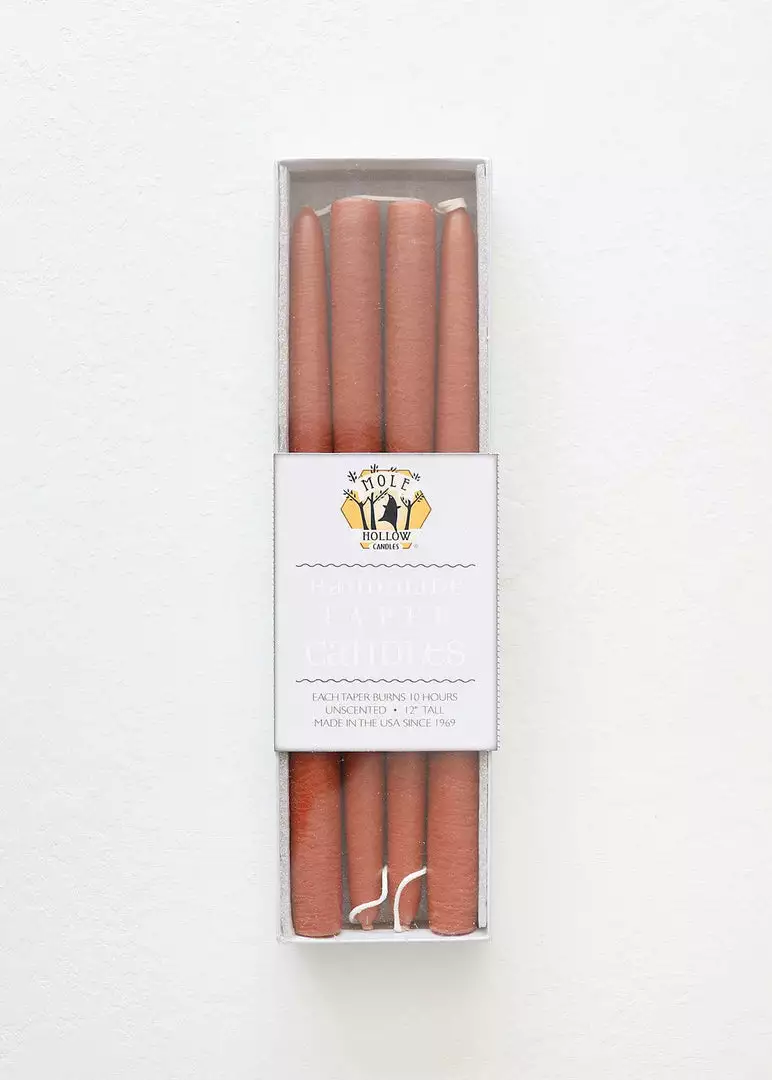 Find colored candles to set the mood of your decor or event, like these unscented, hand-dipped taper candles in Terra Cotta. The warm terracotta color perfectly complements autumn centerpieces and fall weddings.