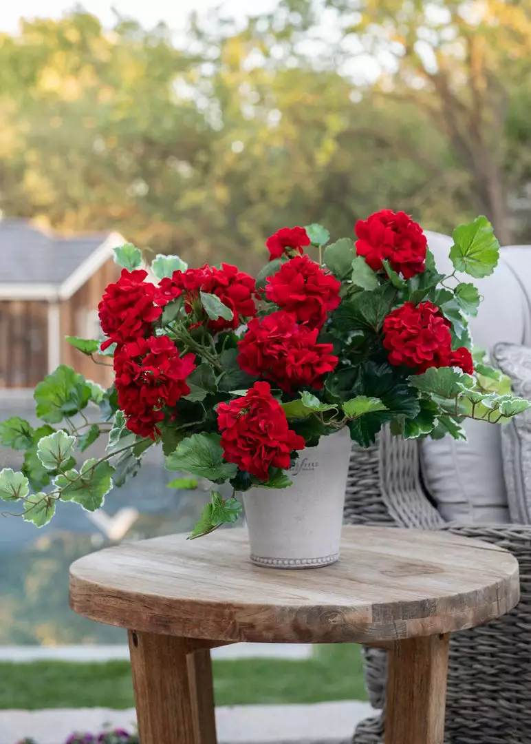 Whether you are enjoying these gorgeous red UV protected silk geranium flowers inside or outside, they will bring the feeling of nature to your decor! You just need to style this artificial geranium bush in a patio hanging basket, a porch planter, or a window box to create an effortlessly beautiful design your guests will envy.