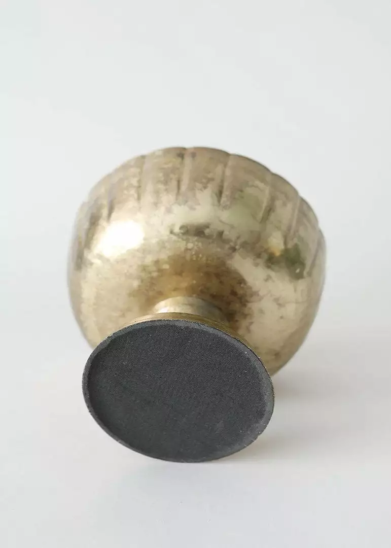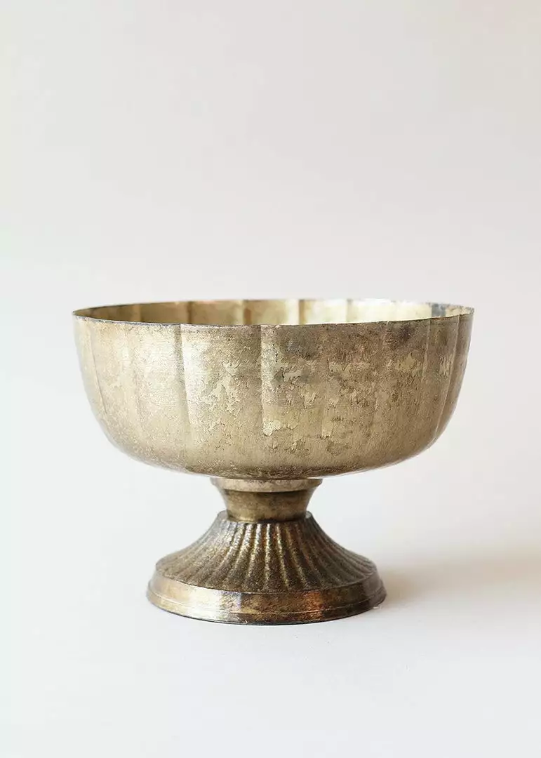 Find gold metal floral containers for your vintage wedding centerpieces like this beautiful distressed gold metal compote bowl. Just fill with your favorite silk flowers to create a simple yet gorgeous arrangement you can display in your home later.