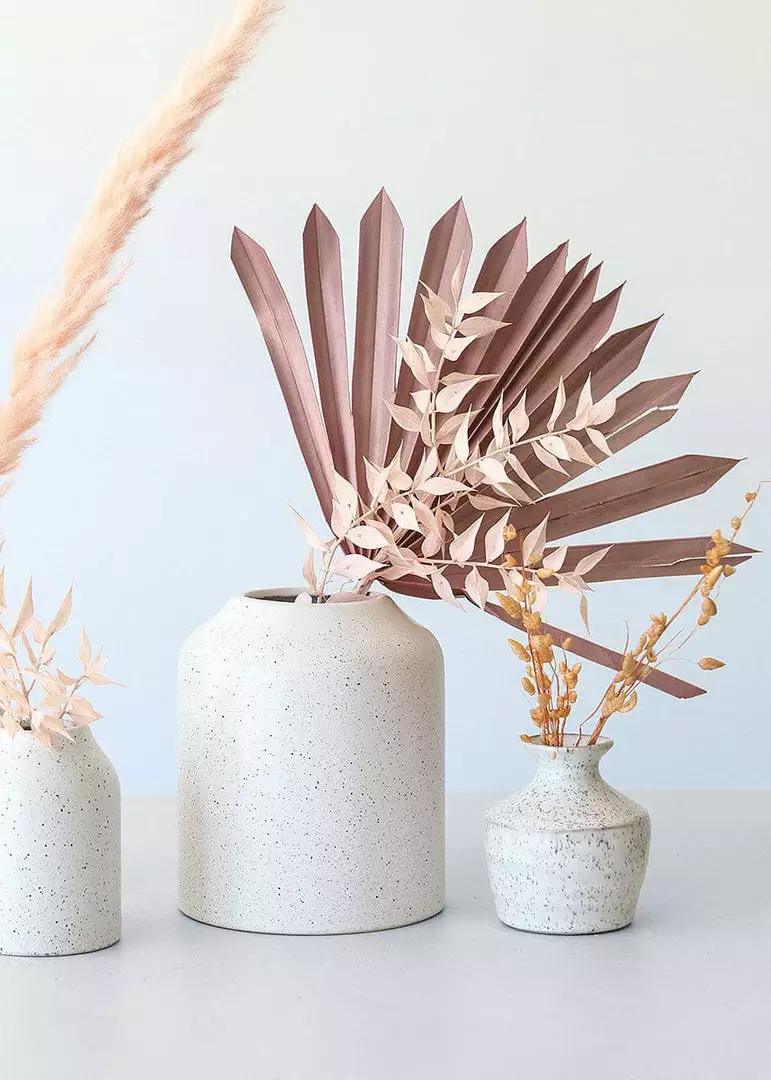 Shop the Flynn Collection for a modern style. This white ceramic speckled vase is perfect for any room, from a kitchen counter centerpiece to side table arrangements.