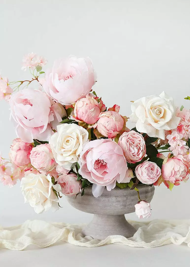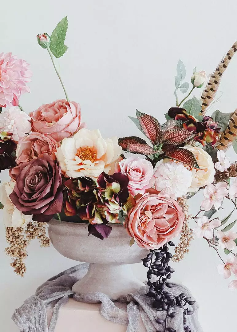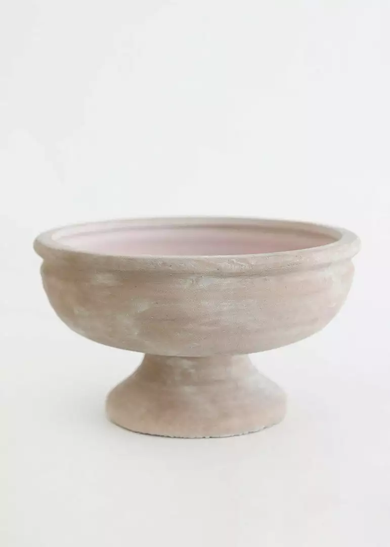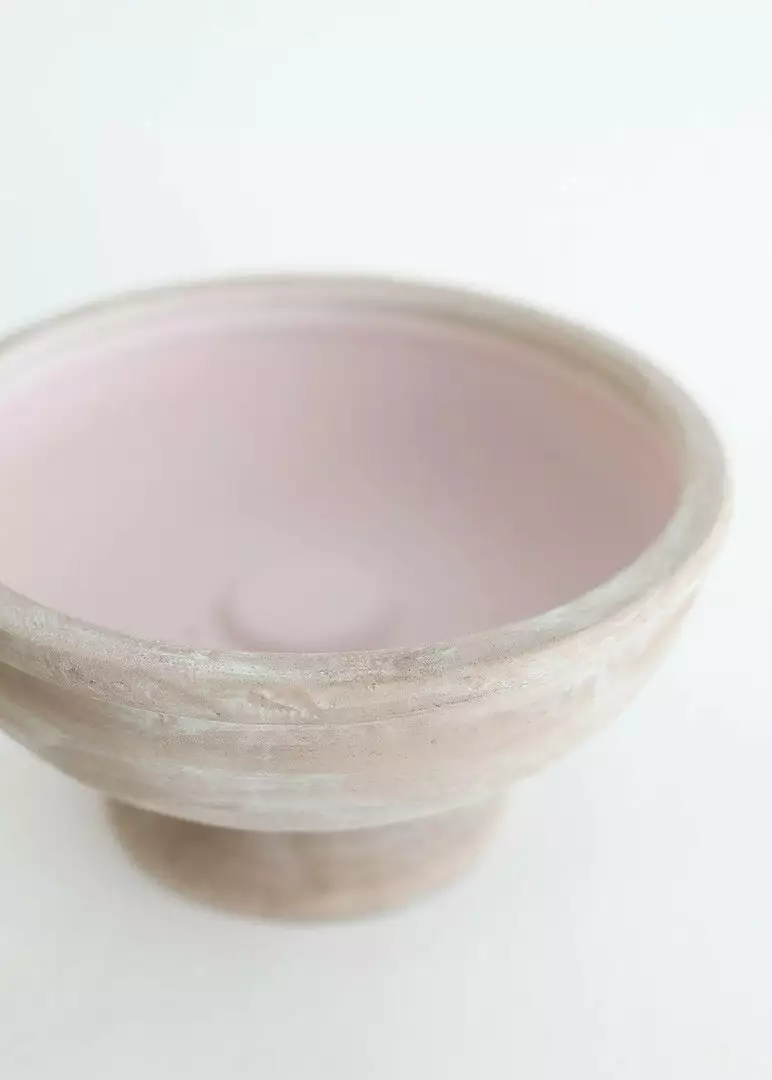 Beautiful ceramic compote bowl in whitewashed sand from the Winnie Collection is great to use as a planter. The inside of the bowl has mauve brown earth tones that complement a boho look.